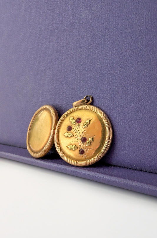 18K Gold Art Nouveau Locket with green gold : Antique Floral Engraved Pendant