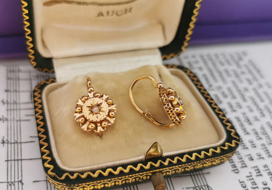 18k Gold Earrings Antique Dormeuses Victorian Earrings Gold Earrings with natural seed pearl Napoleon III 18 K Gold Earrings