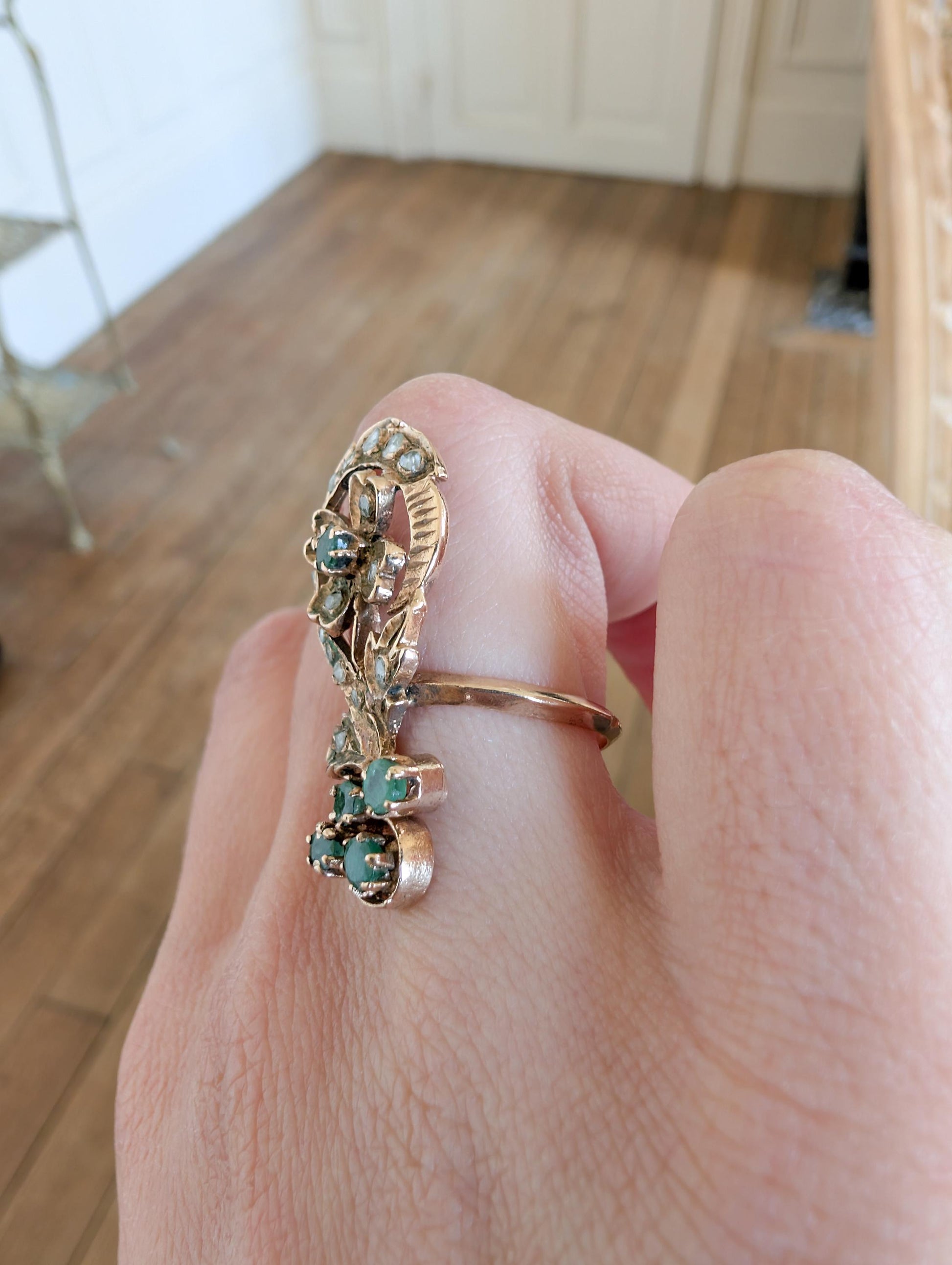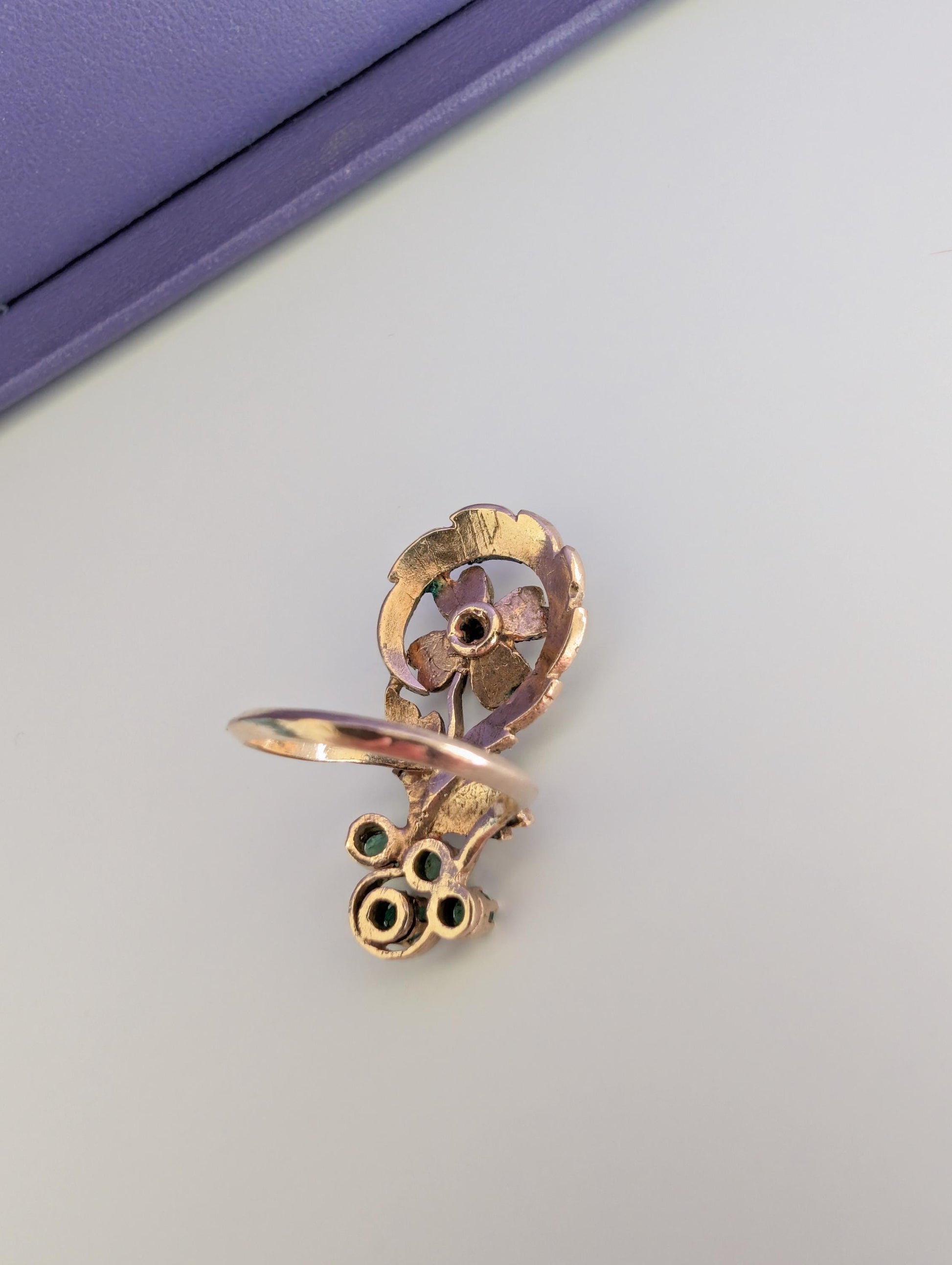 Beautiful Antique ring from the Art Nouveau period with foliage motifs set in 9 carat yellow gold adorned with 18 rose cut diamonds and 5 emeralds. This astonishing delicate ring is a hard find. The ring is open worked, dividing into branch and a flower. It is hallmarked but hard to read so we got it tested by different experts and is in 9k solid yellow gold purity. A stunning piece of jewelry from the beginning of the 20th century, Art Nouveau period. In excellent Antique condition all stones stand strong. Some micro scratches to the gold and tarnish persist on the ring that can be removed with polish, the diamonds and emeralds are in excellent condition and well set.