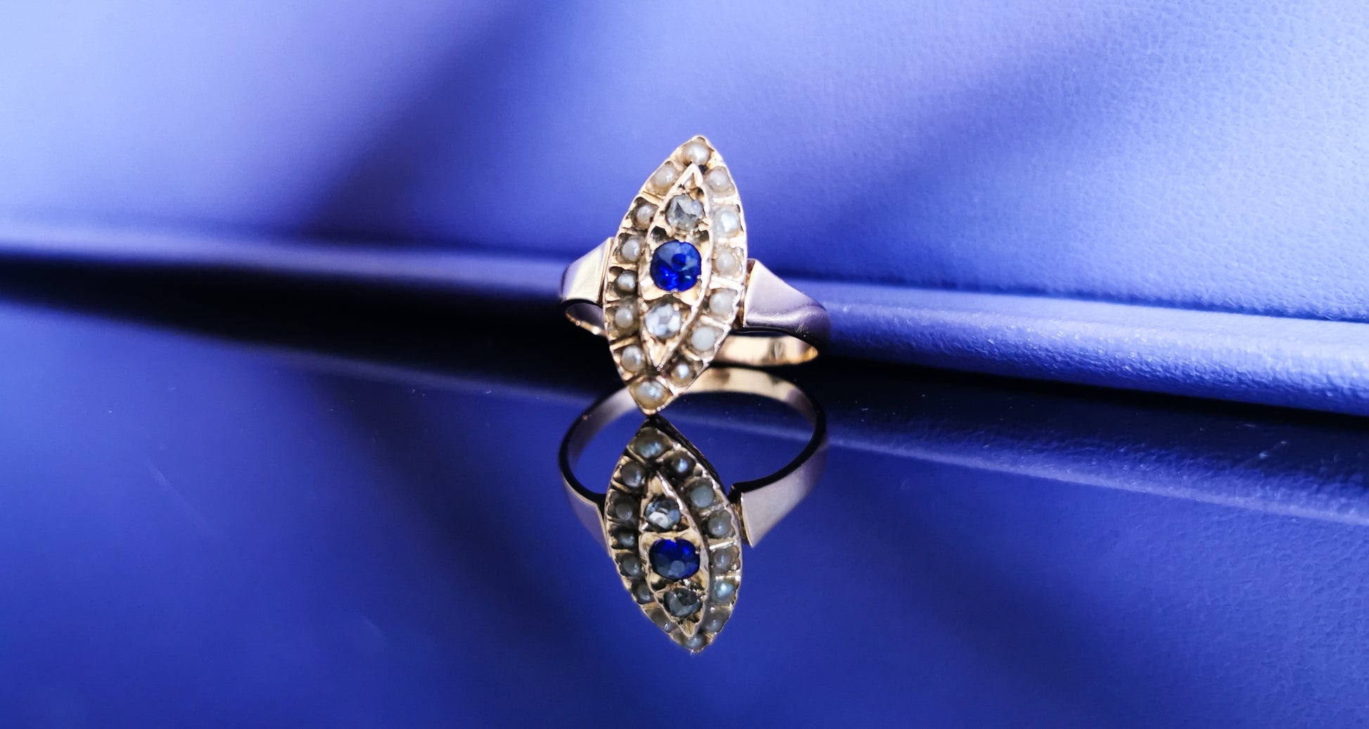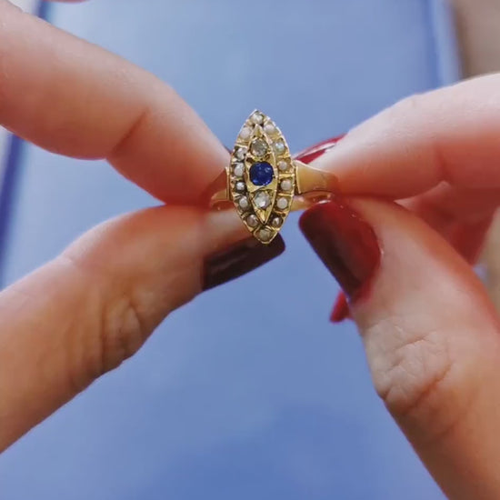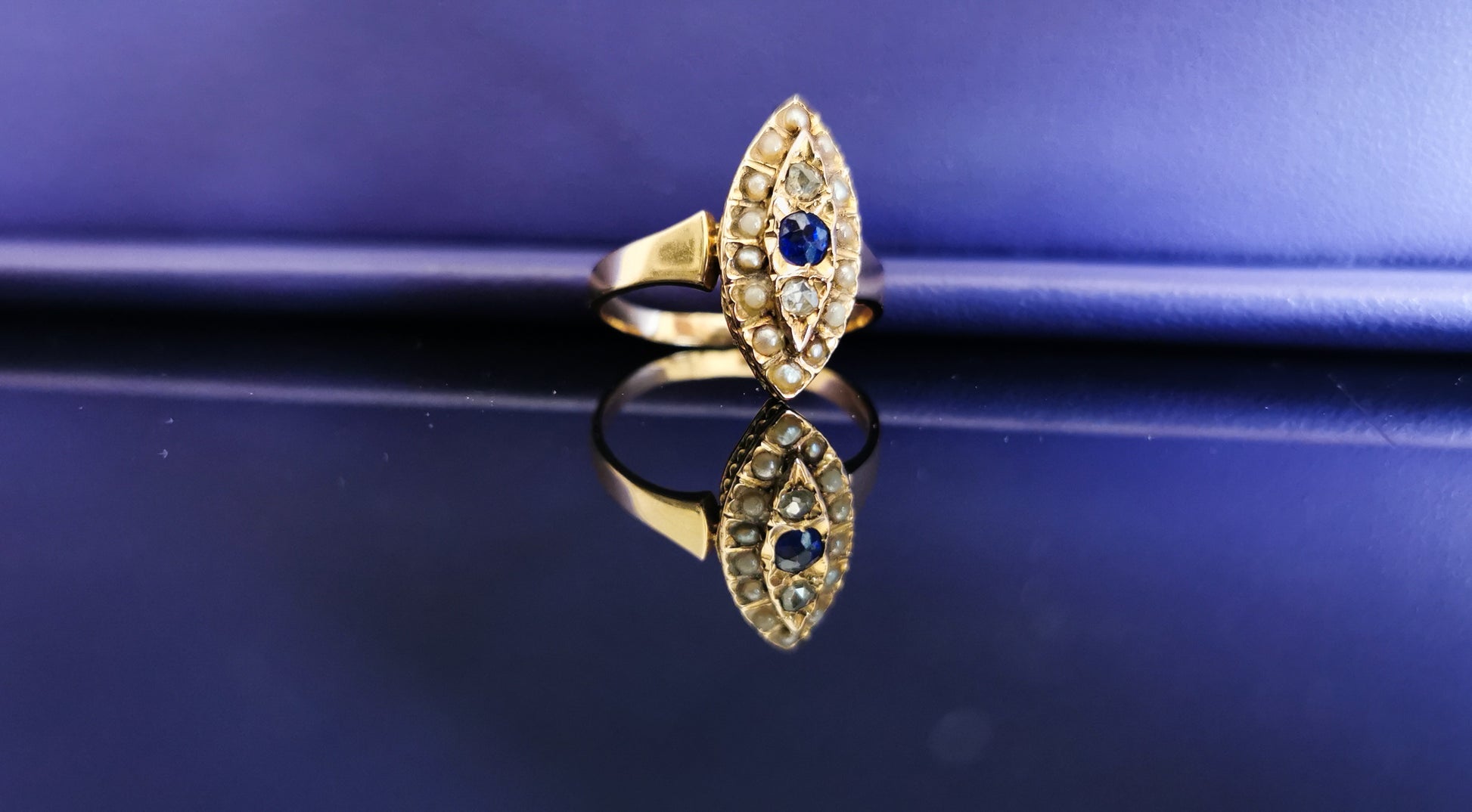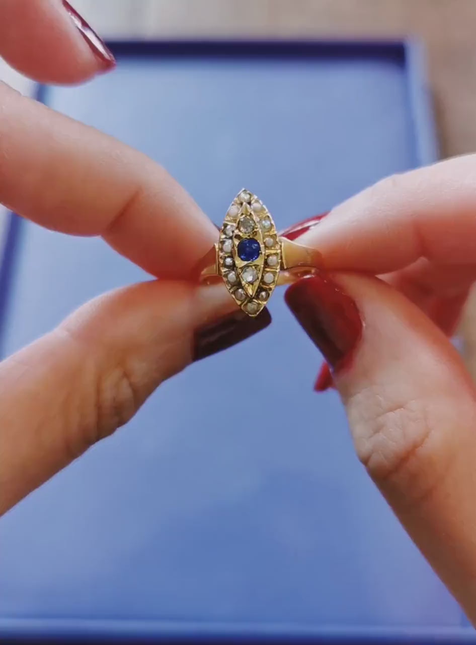 1880s Antique 18k Navette cluster ring Diamond & Pearl Marquise Ring