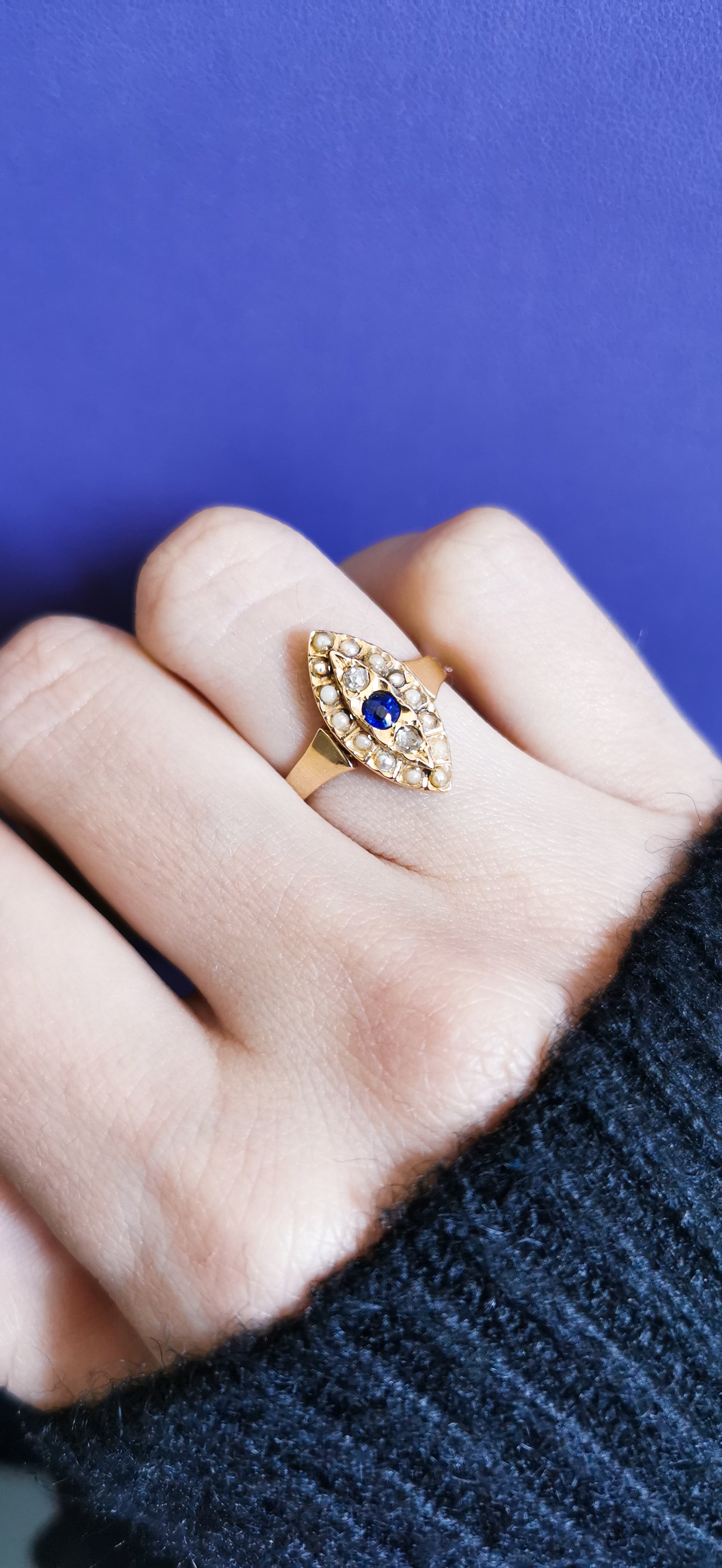 Absolutely unique, this Antique Edwardian ring boasts a band and setting crafted from 18K rose gold, exquisitely inset with 14 natural pearls that have undergone some changes over time. This stunning French ring from the 1880s also showcases two diamonds and a captivating blue doublet stone, reminiscent of a sapphire. The Marquise style of the ring offers a delicate yet timeless elegance, making it an ideal choice for both understated and chic engagement purposes or as a graceful piece for everyday wear.