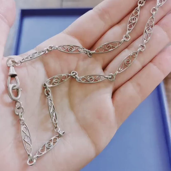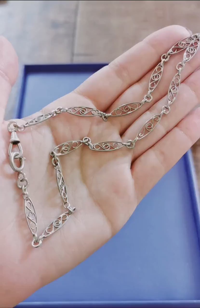 Stunning Antique Silver Filigree double bracelet from the Art Nouveau and La Belle Epoque period, featuring an Albert watch chain with a dog clip clasp. The intricate filigree work on this chain is truly captivating, reflecting the elegance of its era. The necklace boasts a substantial and high-quality design, comprising 13 filigree art links, each separated by connecting links for added beauty and durability.