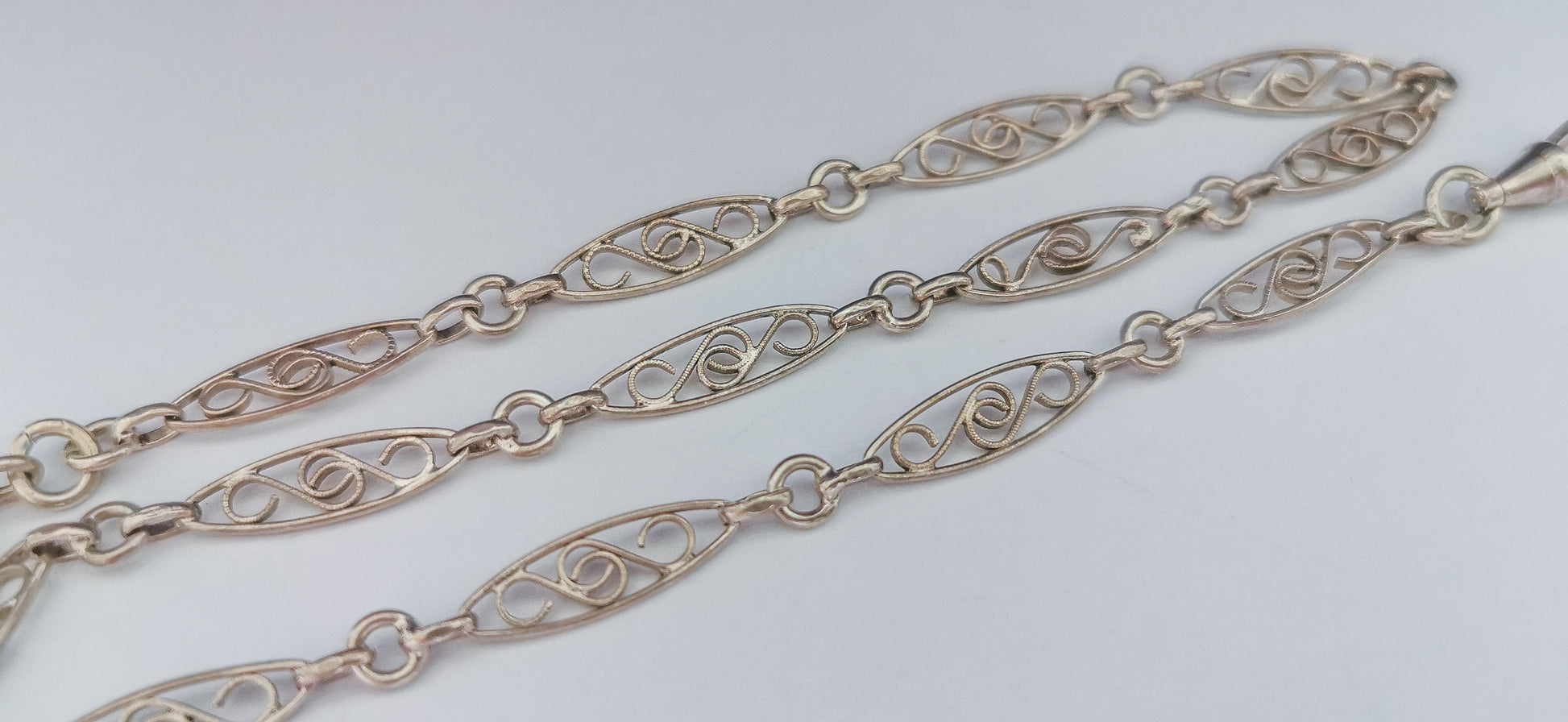 Maintaining its exceptional antique condition, this piece exhibits only very light signs of wear, a testament to its enduring quality. The chain links retain their remarkable shine and detailed design, with minimal tarnish that's mostly concealed within the links and barely noticeable to the naked eye. One of the oval links has undergone filigree restoration, subtly differing from the others but imperceptible when worn.