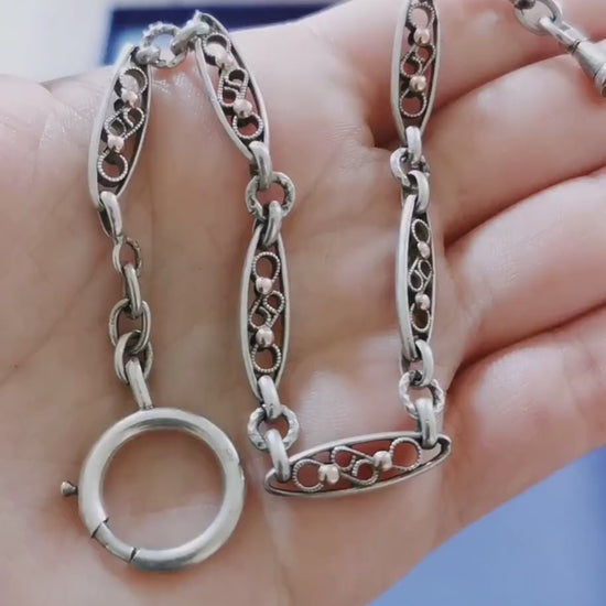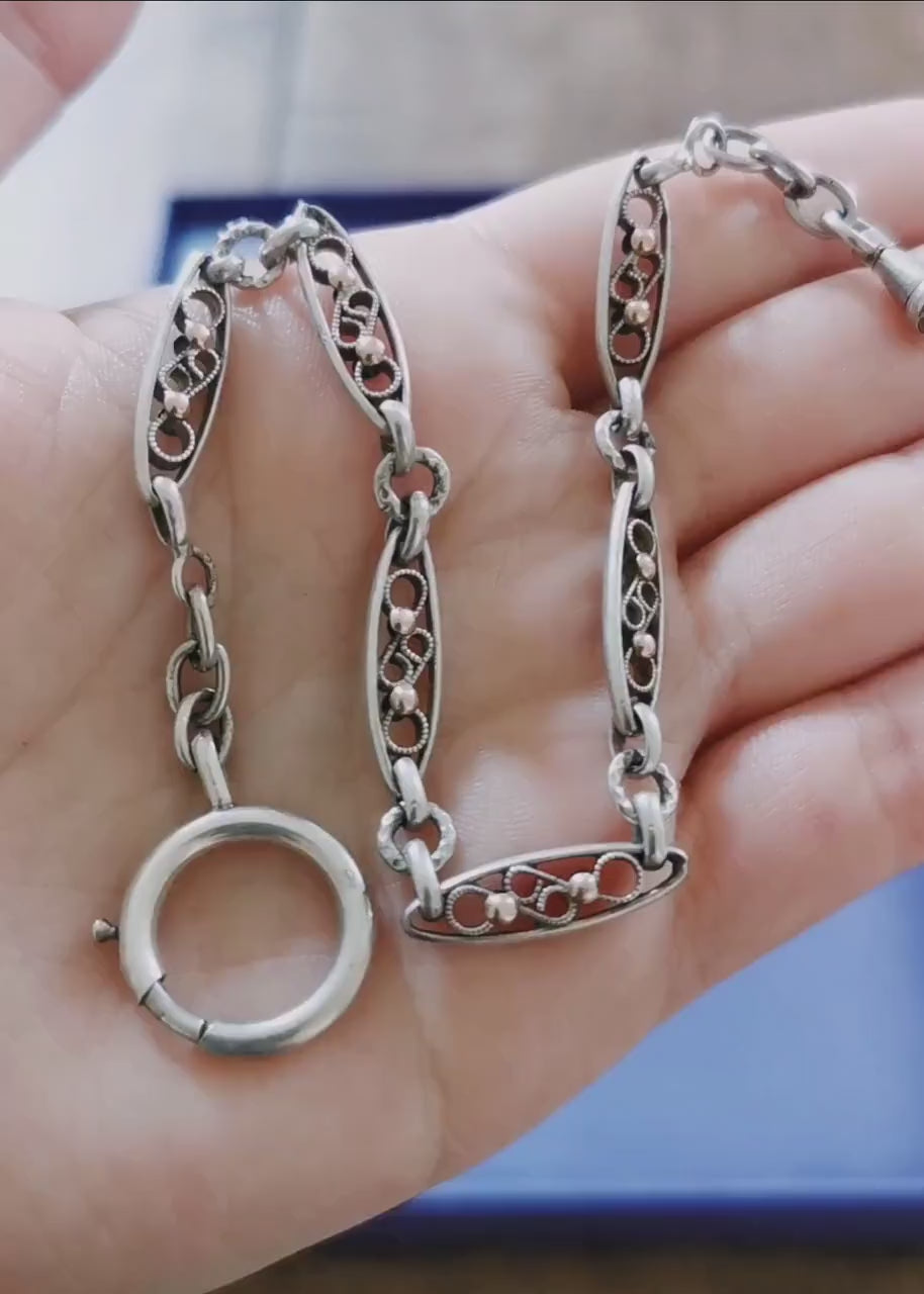 This incredible silver filigree watch chain hails from the Art Nouveau era, La Belle Epoque period. It's a true masterpiece of craftsmanship, featuring a stunning filigree design that captures the essence of the time.