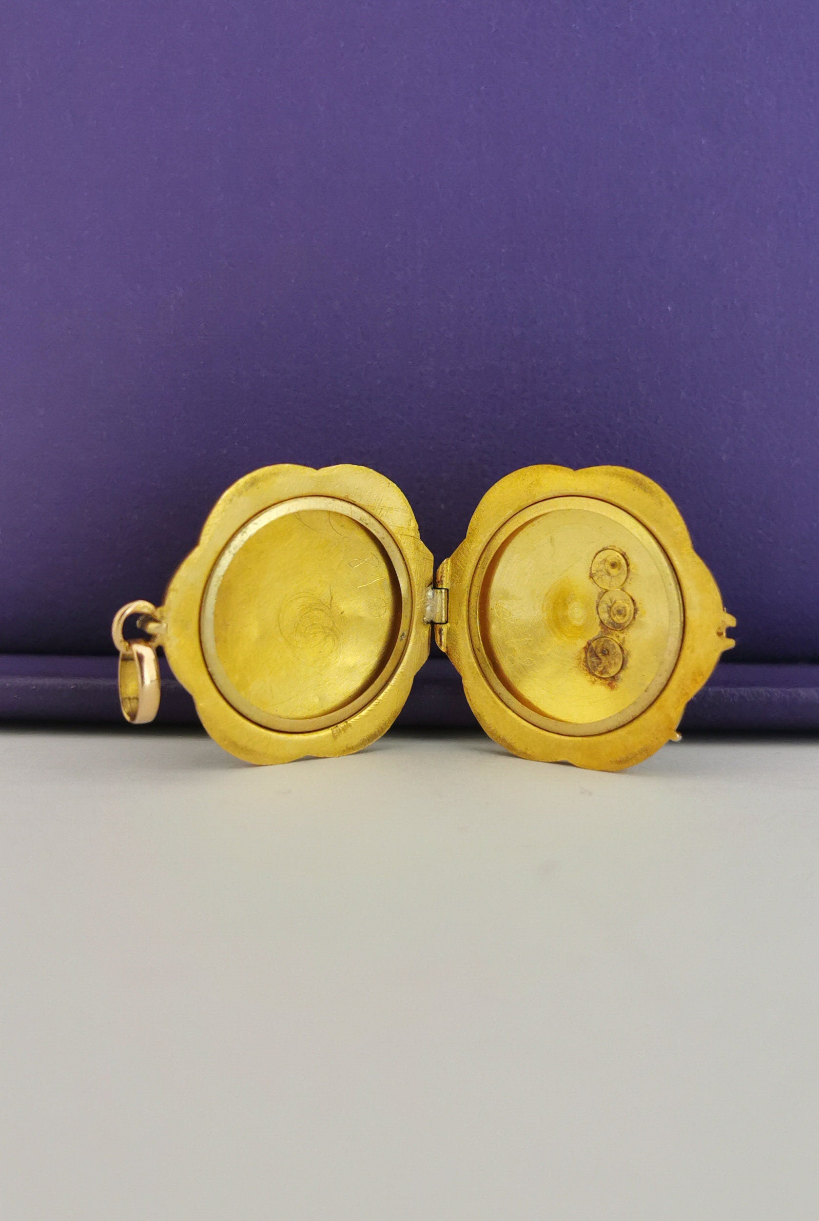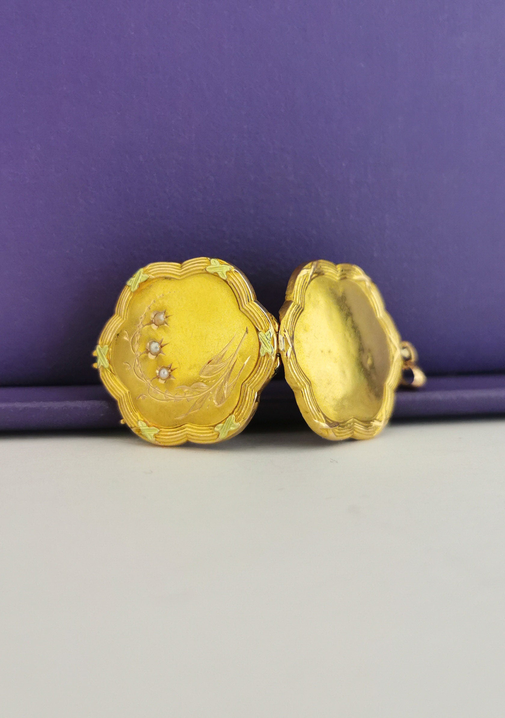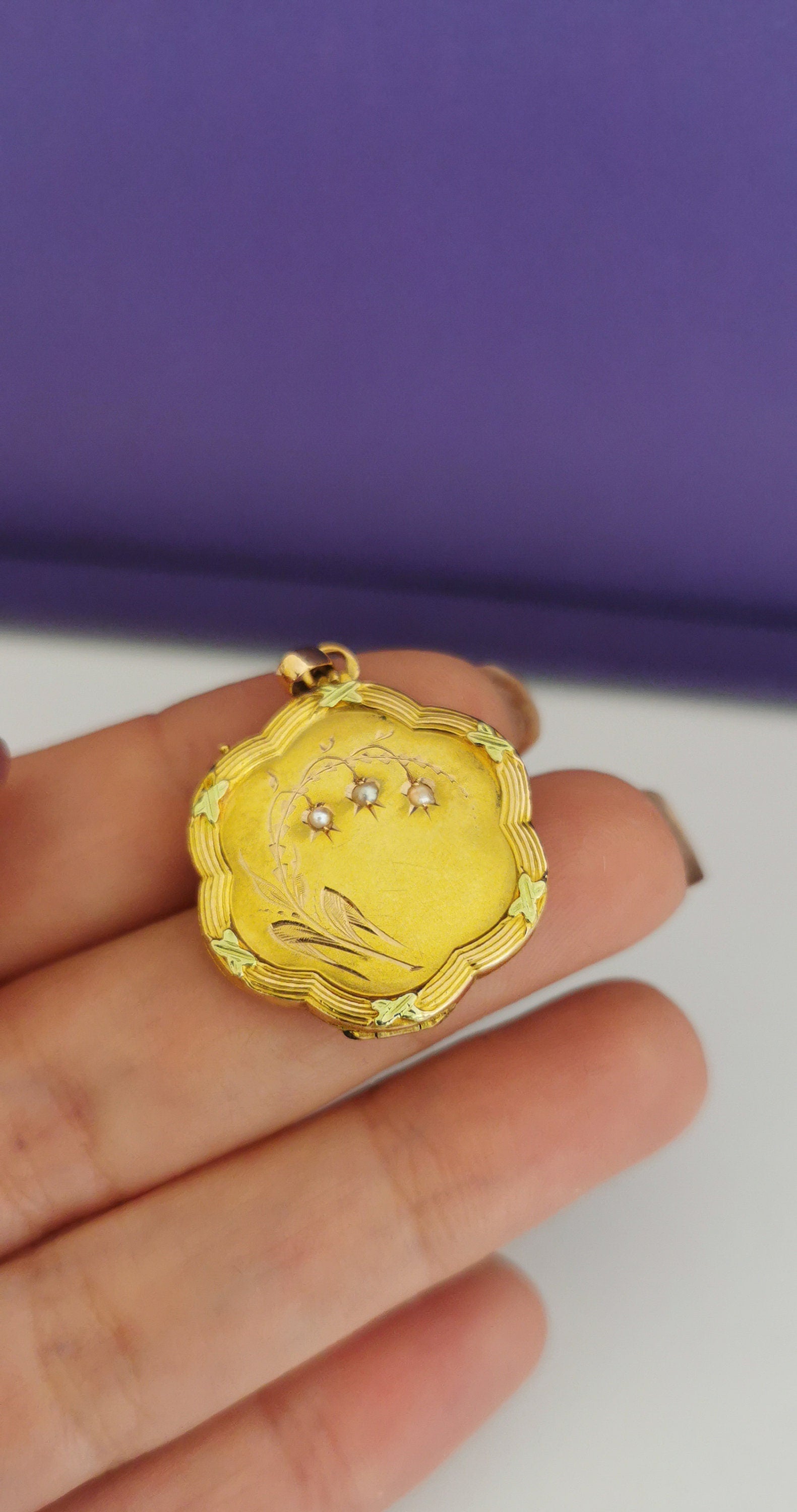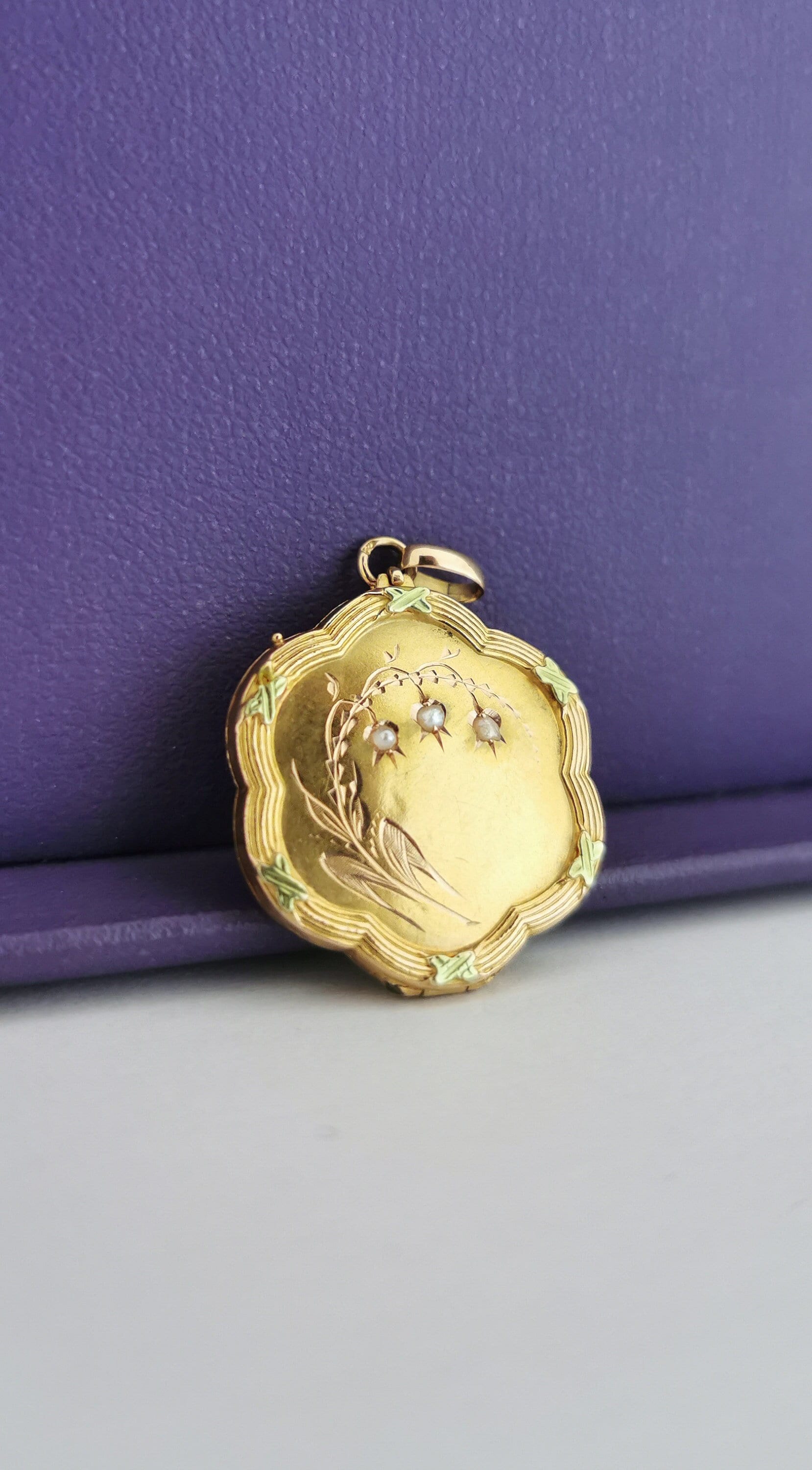 18K 1900 Edwardian Gold Locket Lily of the valley locket with pearl Antique Green and yellow gold Locket with Central Pearl Gift for her