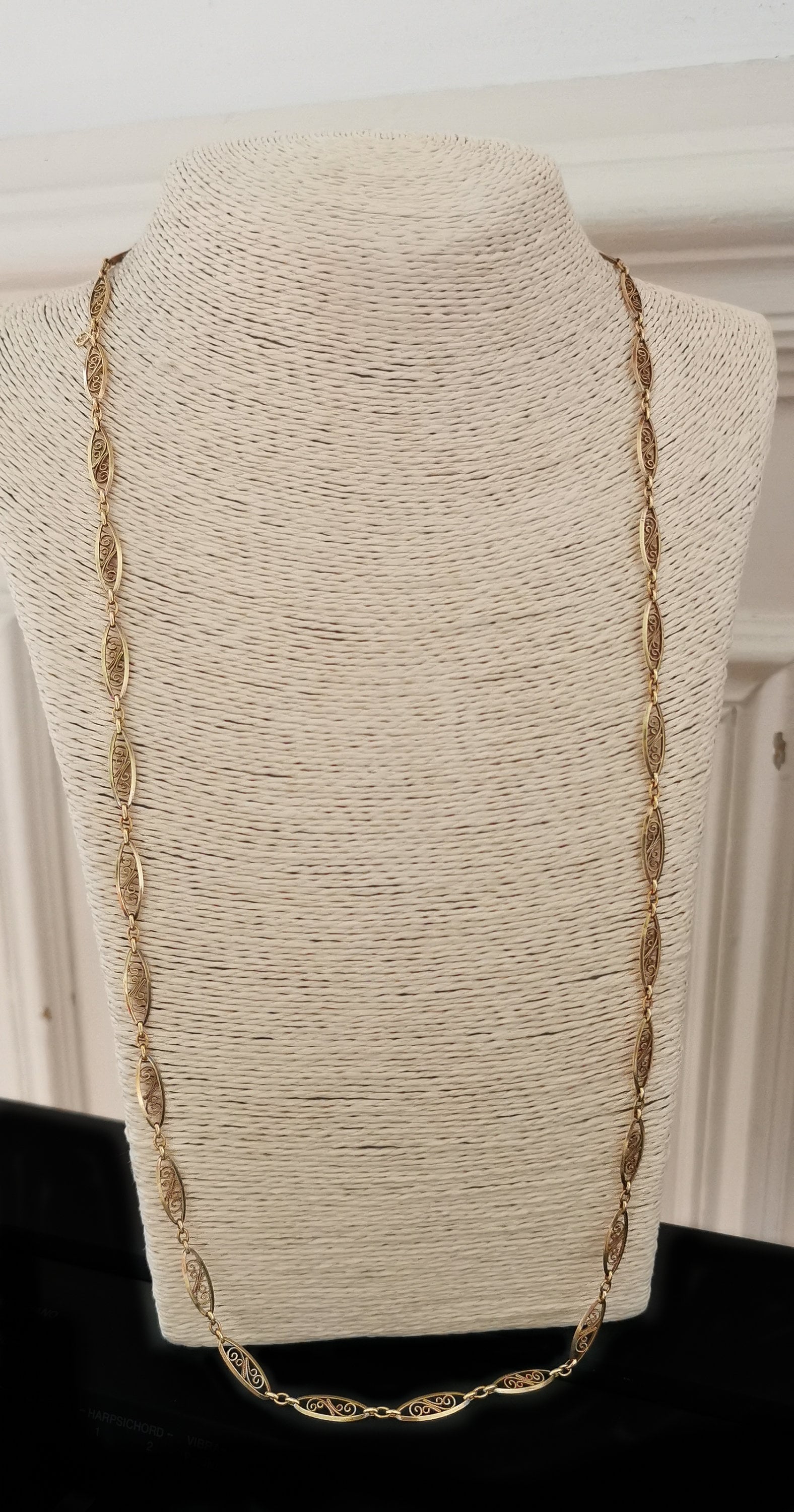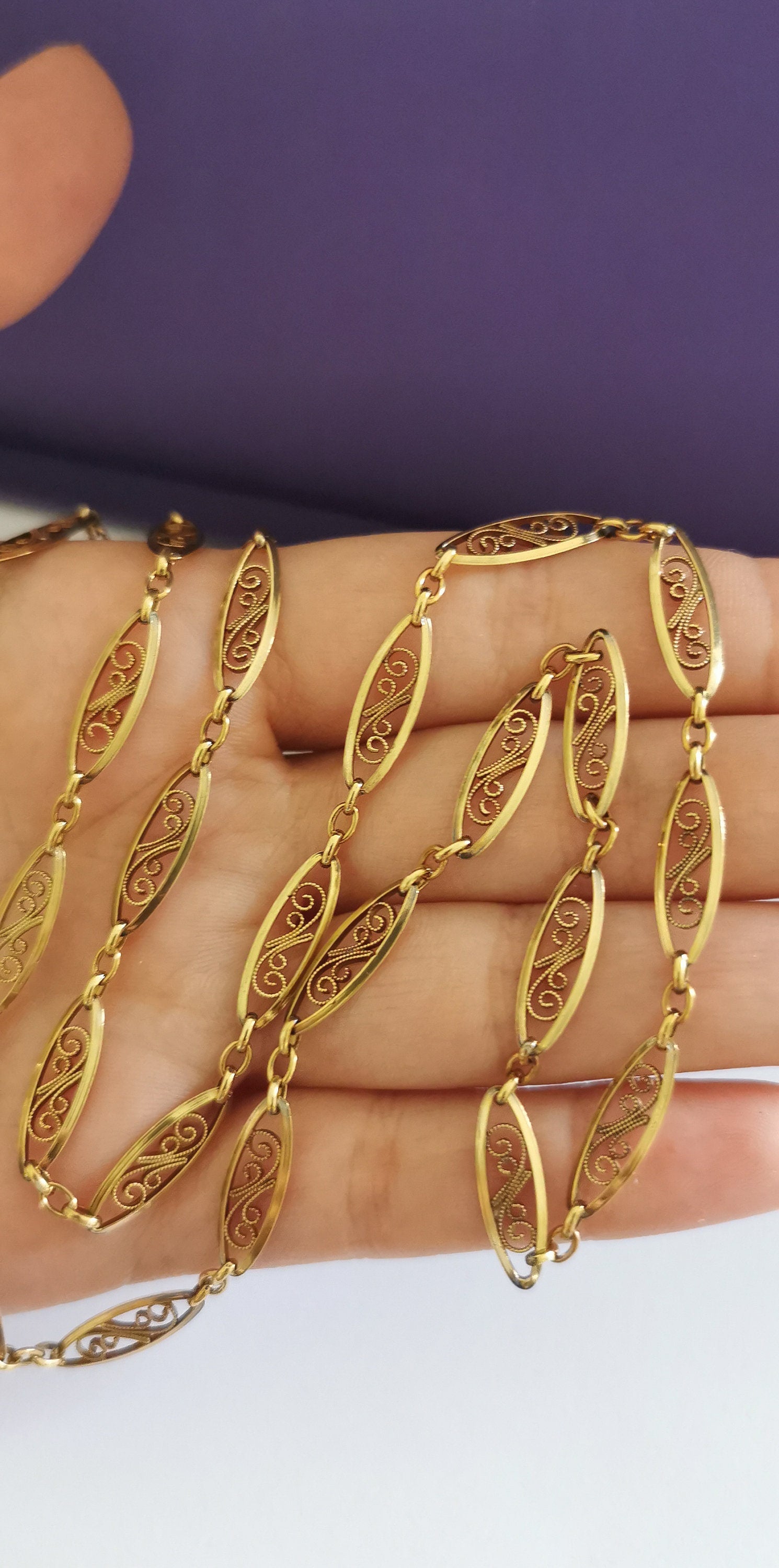 Exquisite Art Nouveau Antique Necklace Chain crafted from high-quality 18K yellow gold during the 1900s. This necklace boasts exceptional filigree links that lend it an air of luxury. Comprising 34 oval lozenge-shaped links adorned with delicate filigree work, all connected by a trace chain, it's a piece that instantly transports you to its era. It's in excellent antique condition, with the chain links gleaming brilliantly in their lovely yellow gold hue. This necklace is not just a piece of jewelry; it's a part of French history and could be the perfect gift.