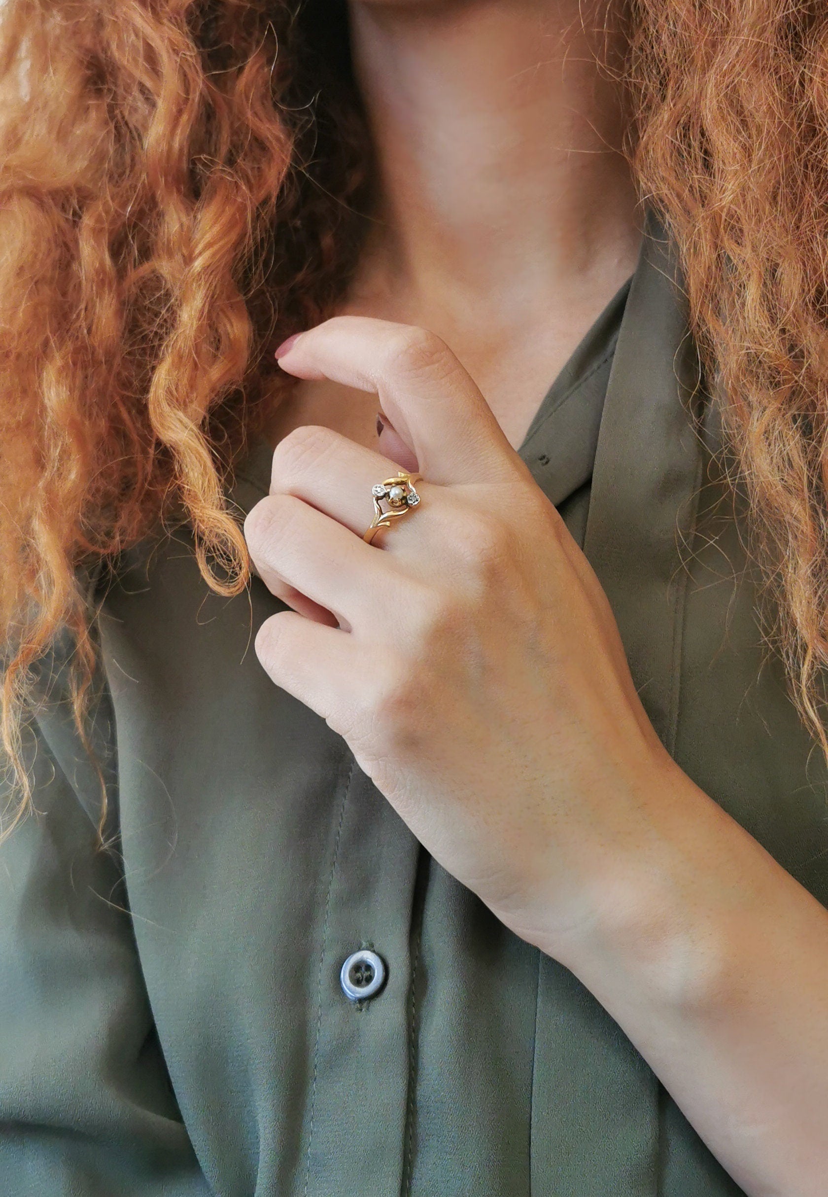 This stunning piece of jewelry hails from the Art Nouveau period, representing the exquisite craftsmanship of that era. It is in excellent antique condition, with all stones securely set. While there may be some minor micro scratches on the gold not visible to the eye. The center pearl has a black small dot on it that helps prevent it from turning, it can sometimes move, so you can turn it back to the sides to get grabed and set again (of corse it is well hold and cannot fall from setting) It is important to care for the pearls and avoid exposing them to damaging products while wearing the ring. The band sides gracefully come together around two gold leaves.