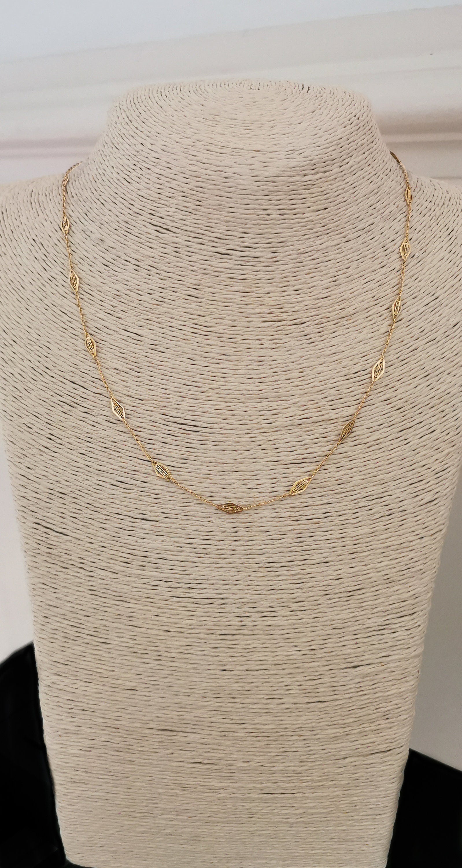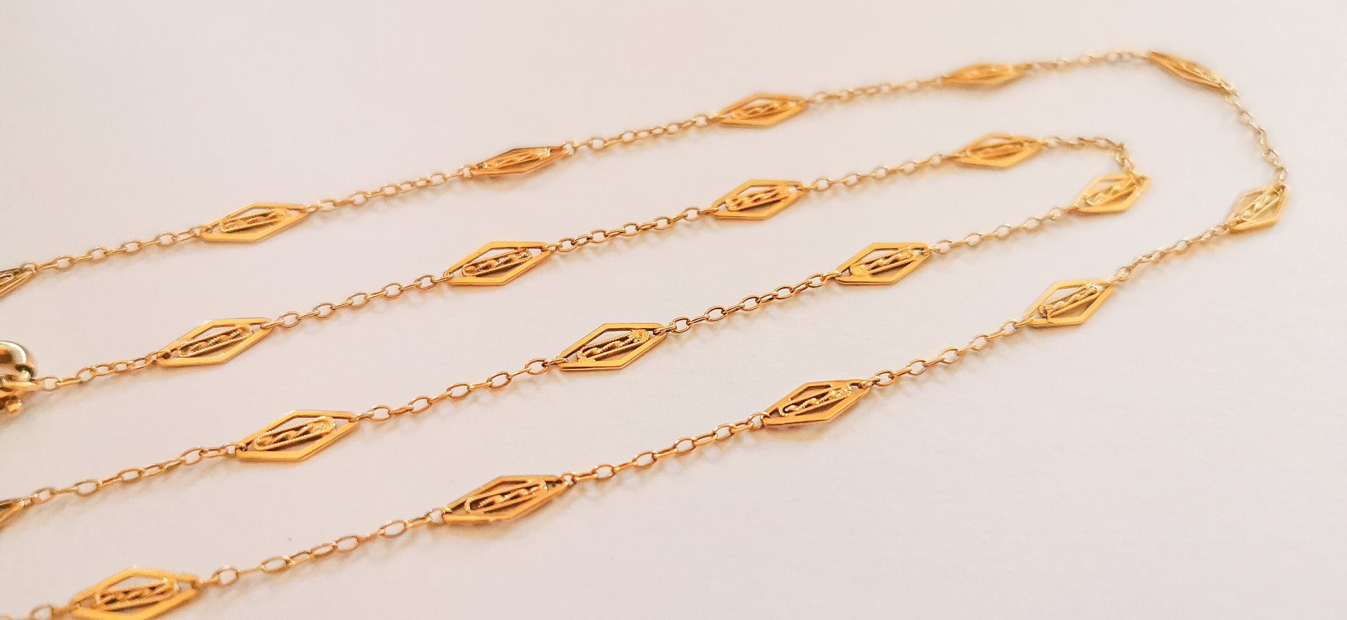 Indulge in the captivating allure of this breathtaking 18K yellow gold necklace from the enchanting Art Deco French period. A masterpiece of meticulous craftsmanship, this necklace boasts 20 luxurious lozenge links, each adorned with an exquisite filigree oval cartouche, showcasing the typical Art Deco design. The links are gracefully connected by trace chain segments, enhancing its overall elegance.