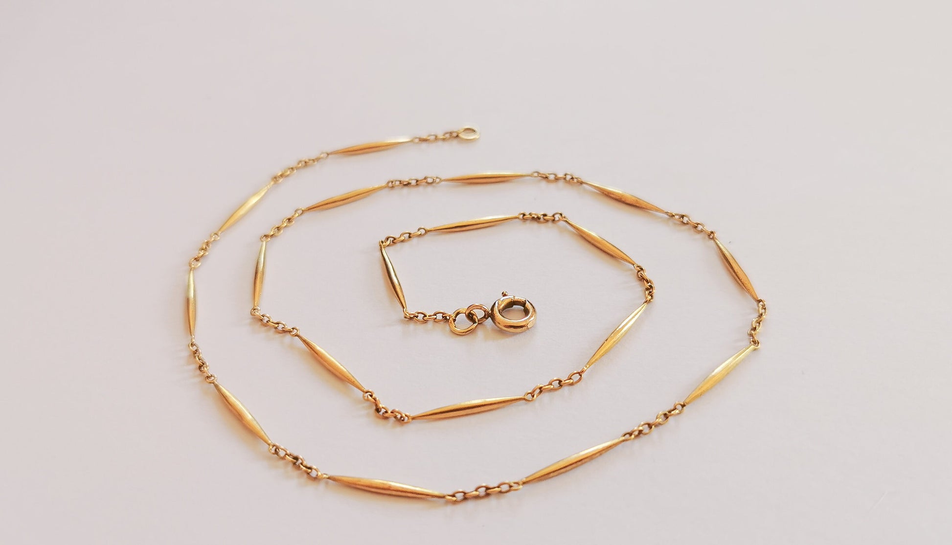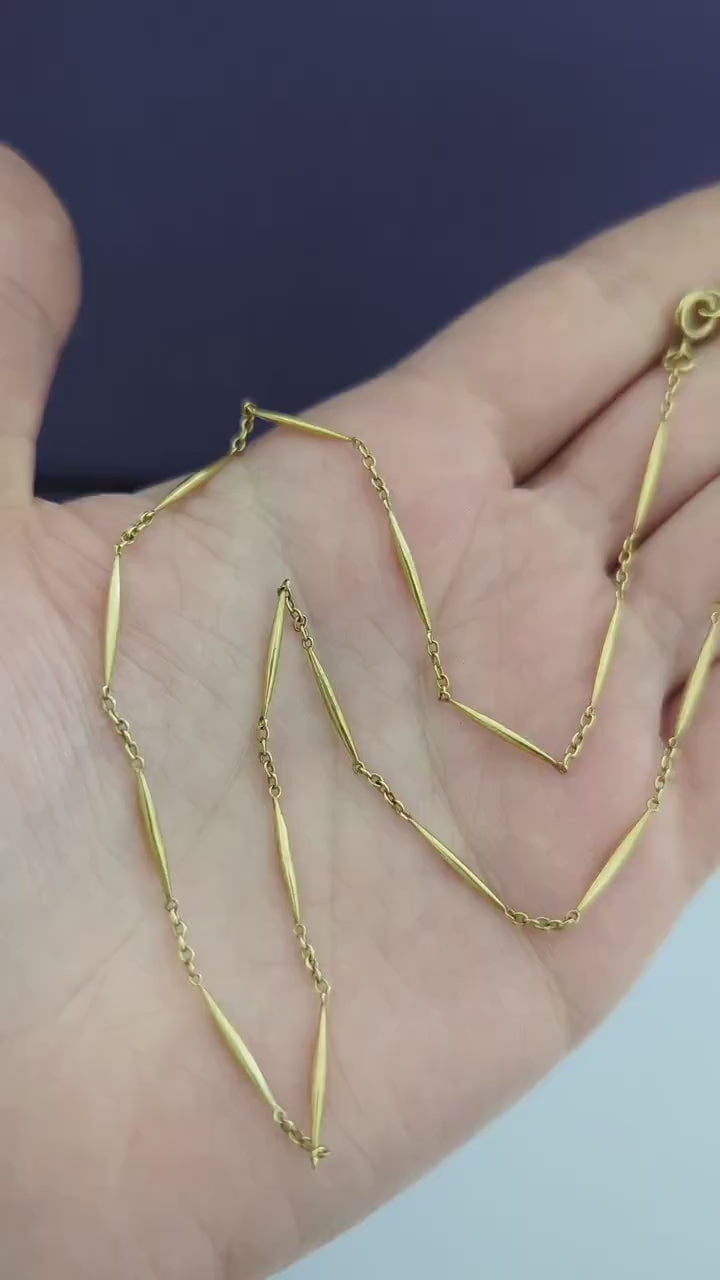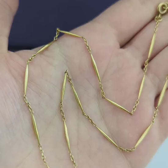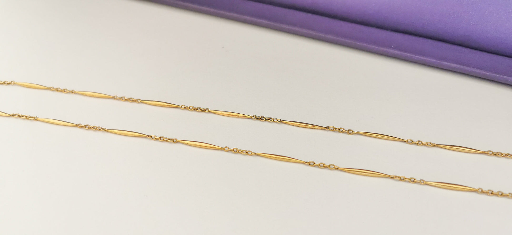 Exuding timeless elegance, this stunning 18K yellow gold necklace hails from the enchanting 1900s French period, blending the graceful styles of Art Nouveau and Belle Époque. Crafted with meticulous craftsmanship, the necklace showcases a sequence of 18 exquisite baguette oval links, delicately interspersed with trace chain segments.