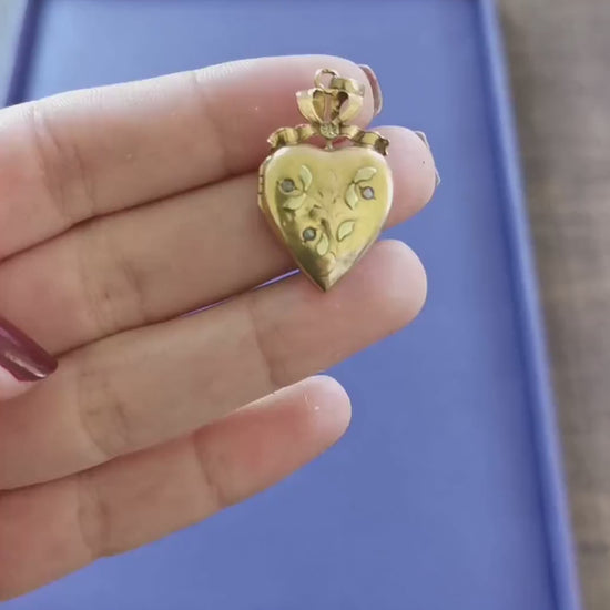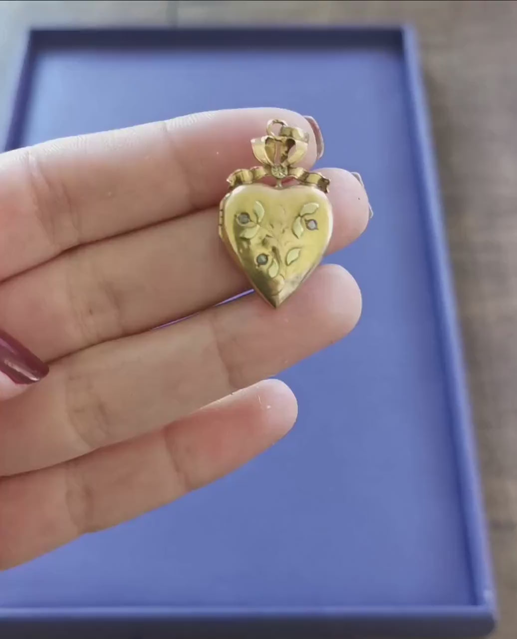 From the late XIX century, early XX it is poetic, the heart is puffy and has beautiful engraved decorative green gold leaf, visible at the bottom of the pendant too on the center bow design. Filled with character and details. 18K gold purity hallmarked with an eagle head on the interior side of the locket. Excellent antique condition with micro-scratches to the gold, and very light dents not visible when worn as mostly on the back. a very light dent on the front. Very light tarnish that can be removed with gentle cleaning with time as it cannot enter a bath to protect the seed pearls. An astonishing locket of the Art Nouveau Period that will make your heart beat.