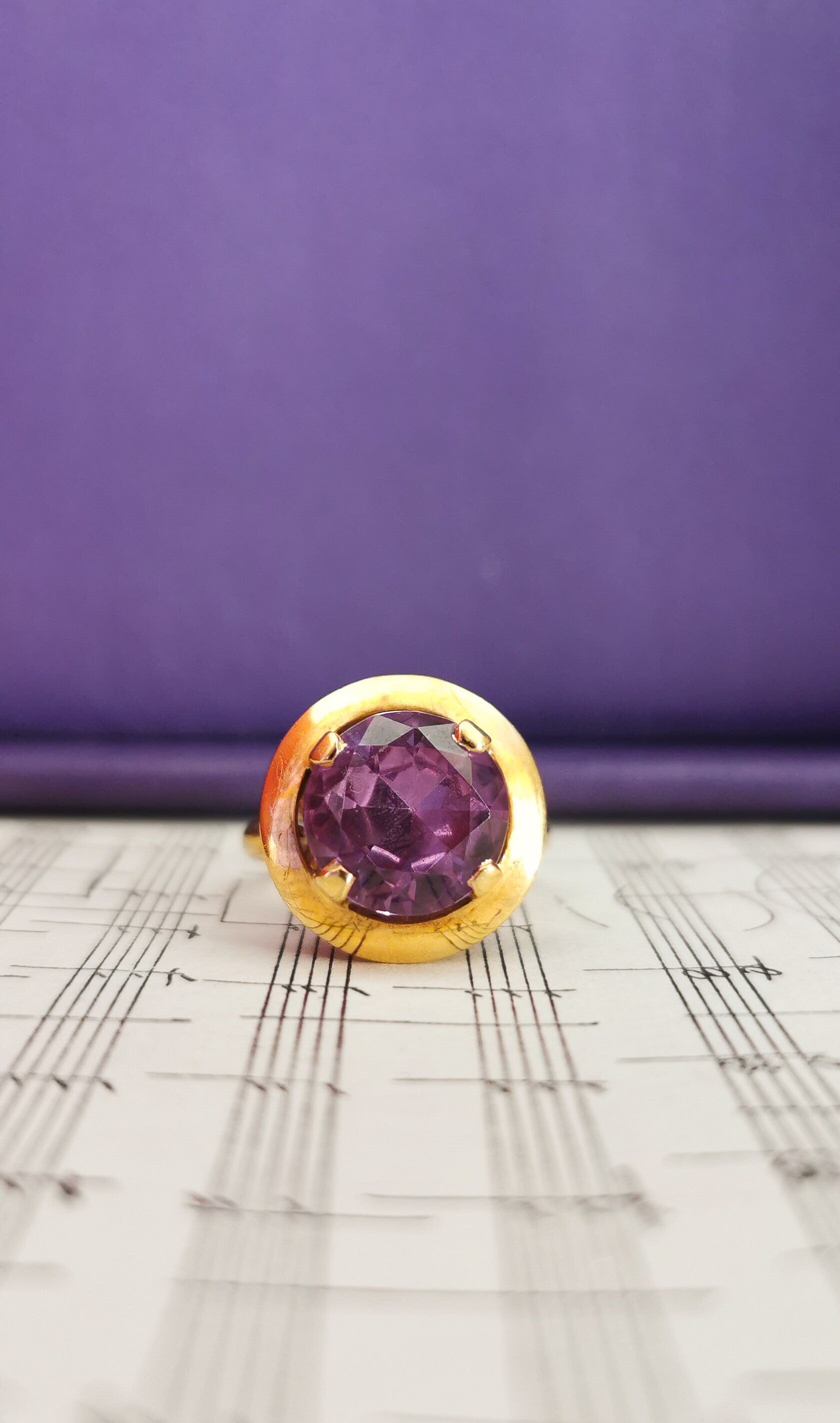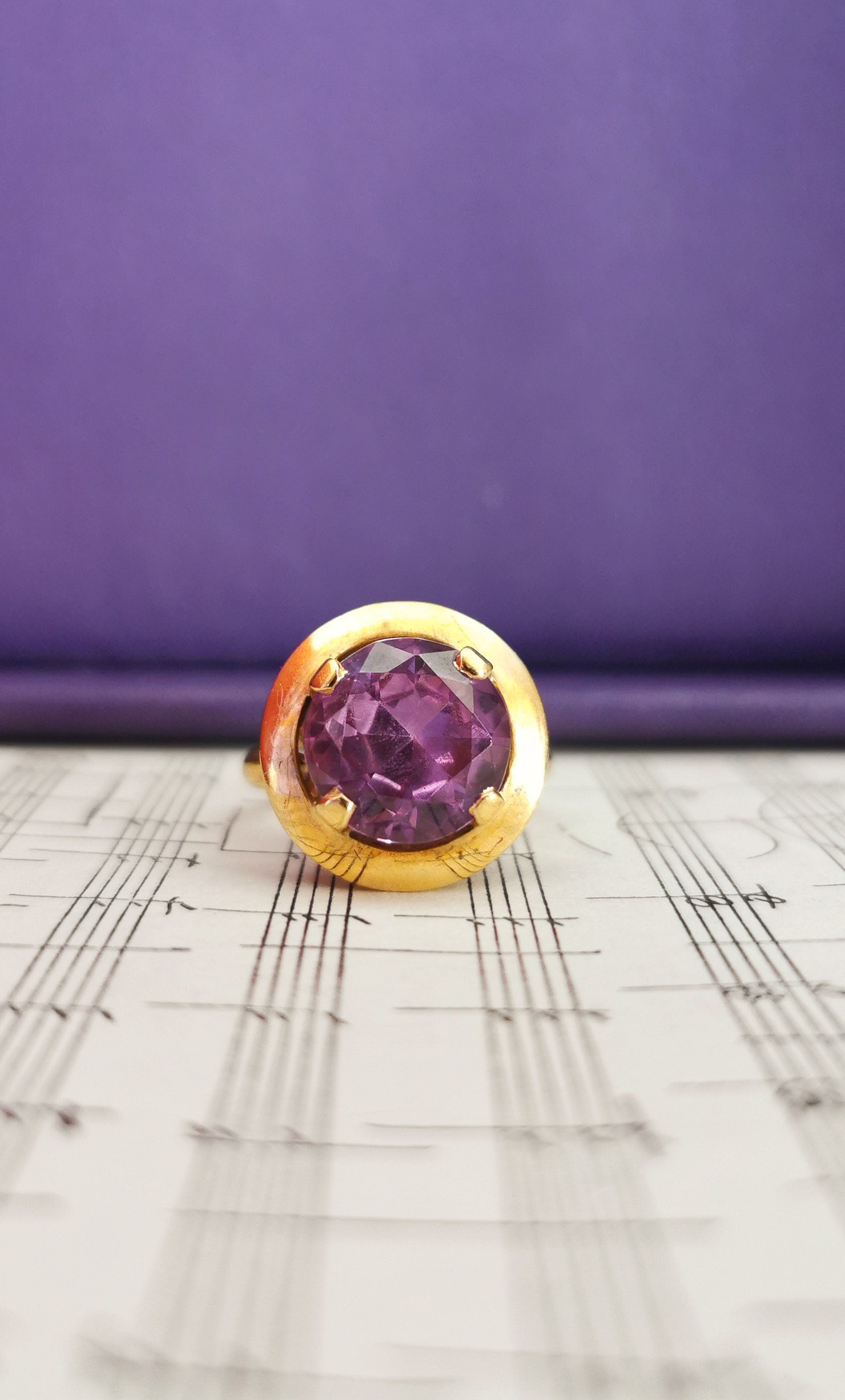 The ring is centered by a 1.2 cm diameter so approx 0.47 inches Big and thick absolutely perfect natural Amethyst stone. It is marked by an eagle Head Hallmark, which stands for an 18ct purity Gold. The ring in in really good vintage condition, with some micro scratches to the gold, nothing to be noticed when worn.