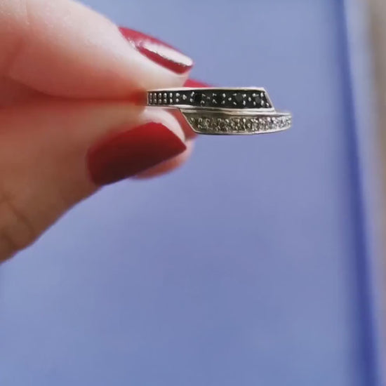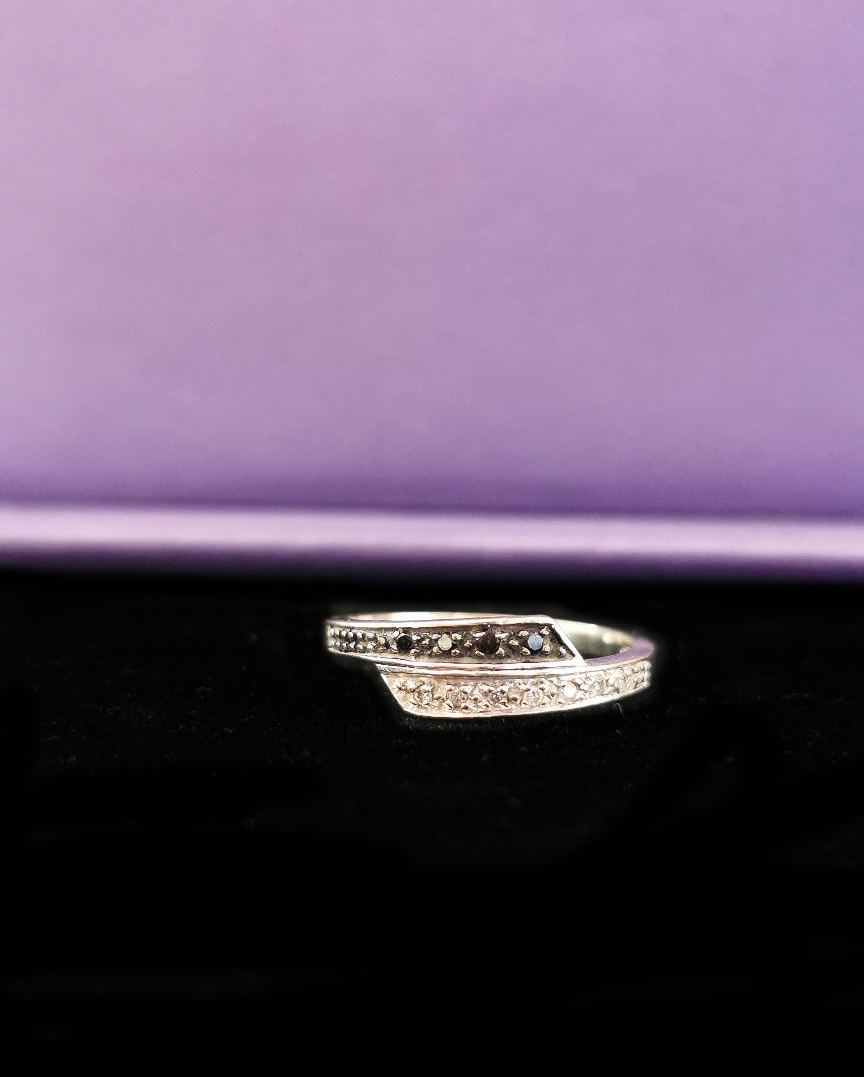 Really chic 18K diamond ring made of 2 different diamond colors. Set with 7 white rose cut diamonds and 4 black ones.
