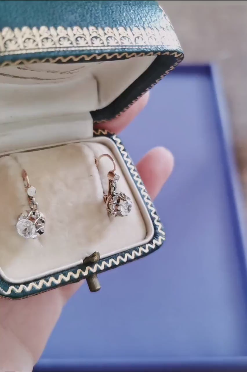 These earrings are appropriately named "trembleuses" due to the delicate floral part that holds the crystal, gently trembling and swaying to create an alluring effect when adorned. The setting, made of 18K yellow gold, is hallmarked with an eagle head, a mark of authenticity. To ensure the gold's purity, we had it tested and certified. The intricate floral cut design on the front is rendered in white gold, adding an extra layer of elegance.