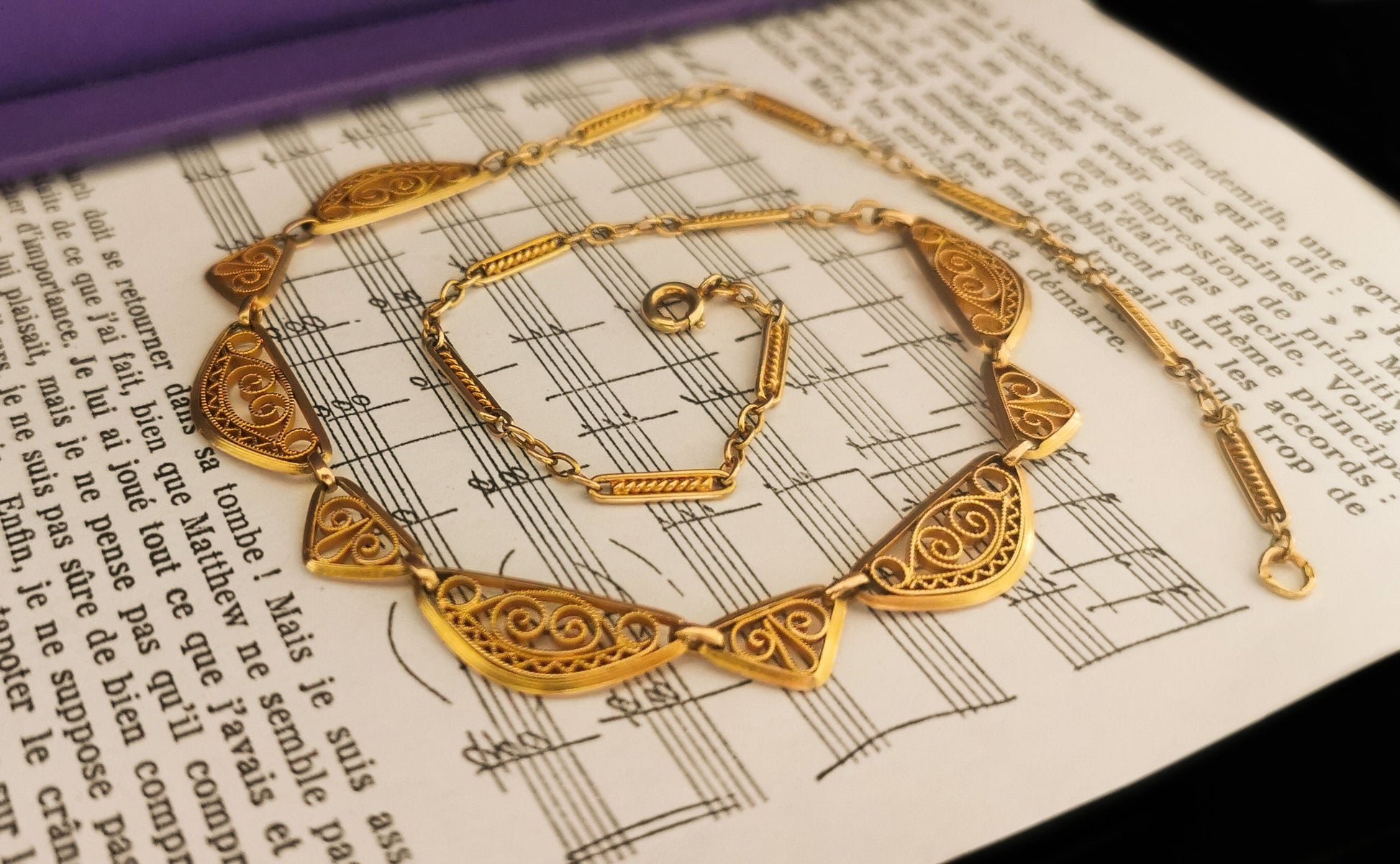Late XIX early XX century luxurious Drapery necklace, crafted during the French Edwardian period. This luxurious piece showcases nine decorative filigree panels, each adorned with a timeless interior filigree arches motif design and waves. With five larger panels and five smaller ones, this necklace truly stands out. The chain of the necklace itself consists of ten stunning twisted oval panels.