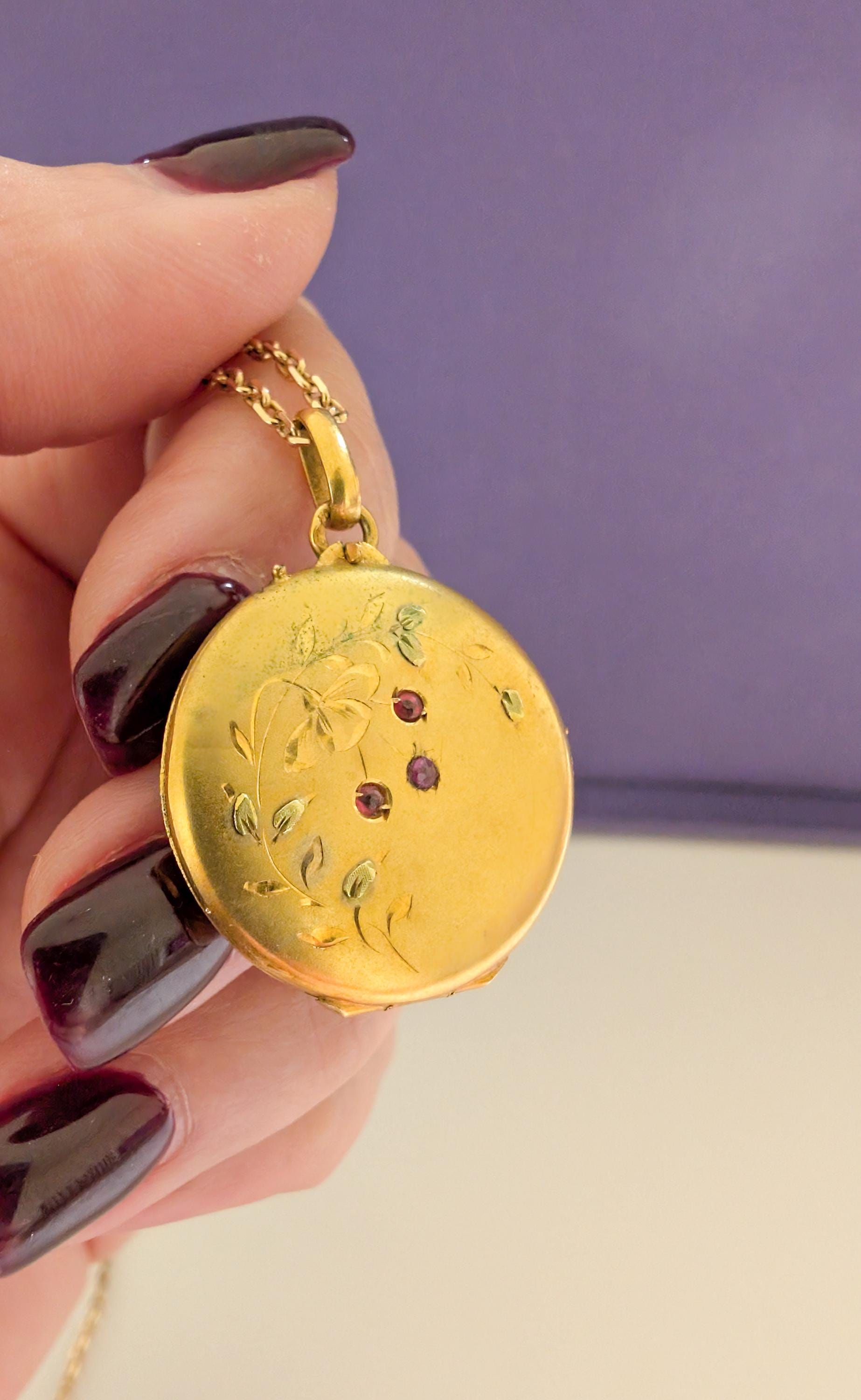 Poetic floral locket from the incredible Art nouveau period dating back from the late XIX century. This 18K solid yellow Gold Locket captures the essence of the late 1800s craftsmanship. Crafted in captivating yellow gold the locket showcases a floral engraving with leaves in green & yellow gold and nature patterns in relief on the front holding 3 red stones enhancing this piece for an eye catching look.