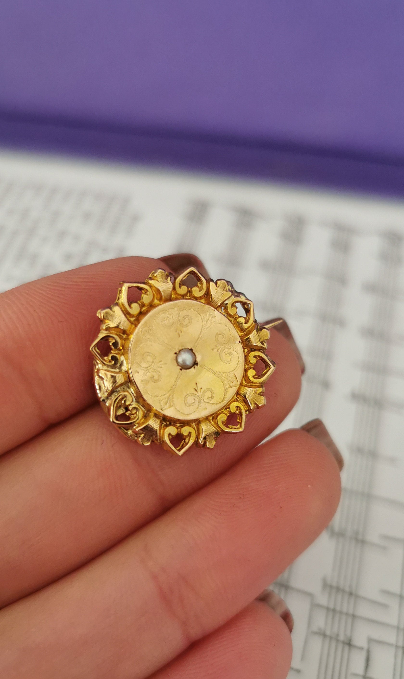 Gorgeous late XIX century Brooch made of beautiful 18ct yellow gold setting with stunning patterned heart and leaf borders. It holds a centered natural pearls surrounded by heart pattern engravings and engraved borders enhancing the beauty of this historical piece. It is in good antique condition, with micro scratches consistent with age one of the sides has a cut but it is not visible when worn and even if the brooch is slightly torn it won't be noticed.