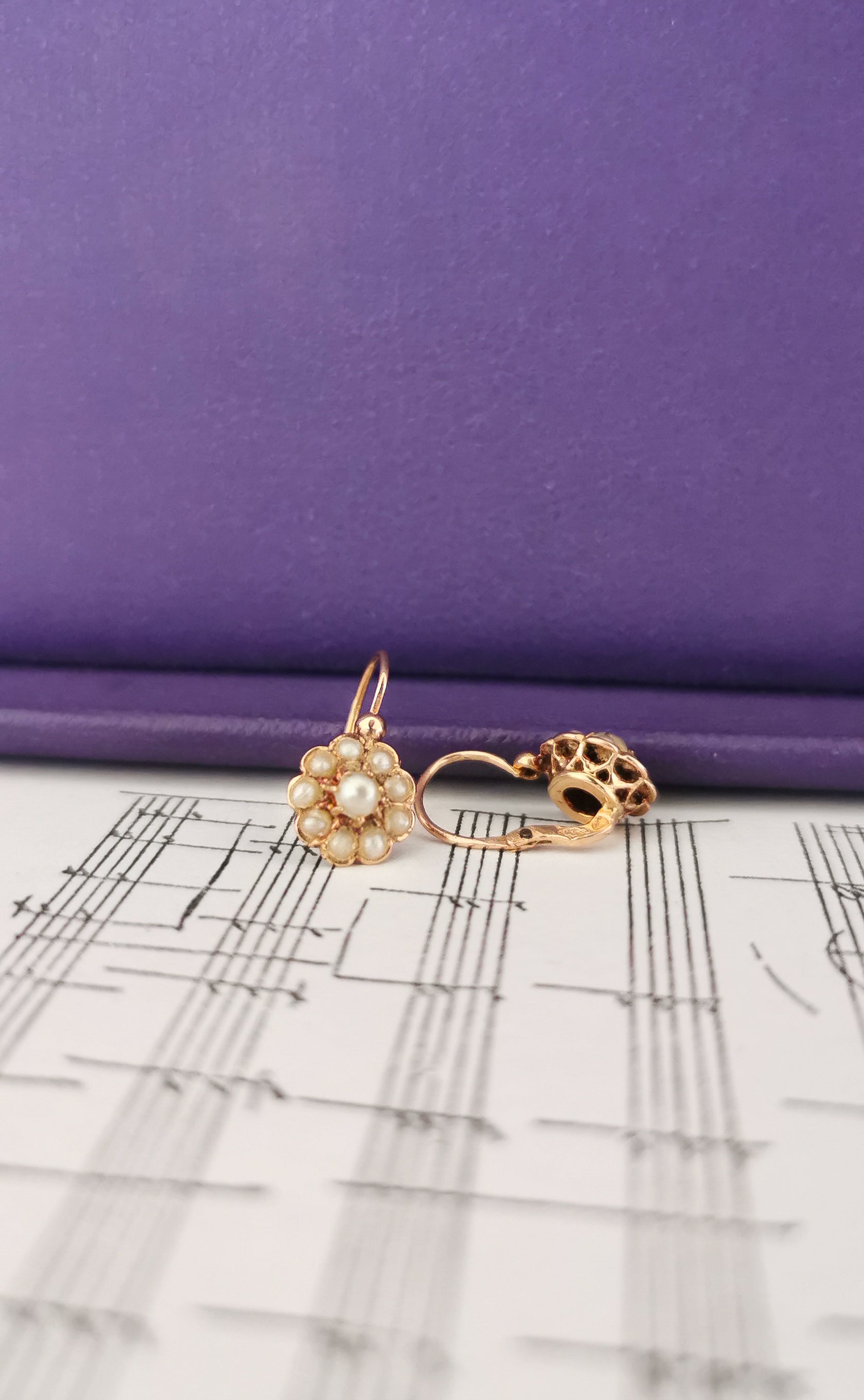 18k Gold Earrings Antique Dormeuses Victorian Earrings Gold Earrings with natural seed pearl Napoleon III 18 K Gold Earrings