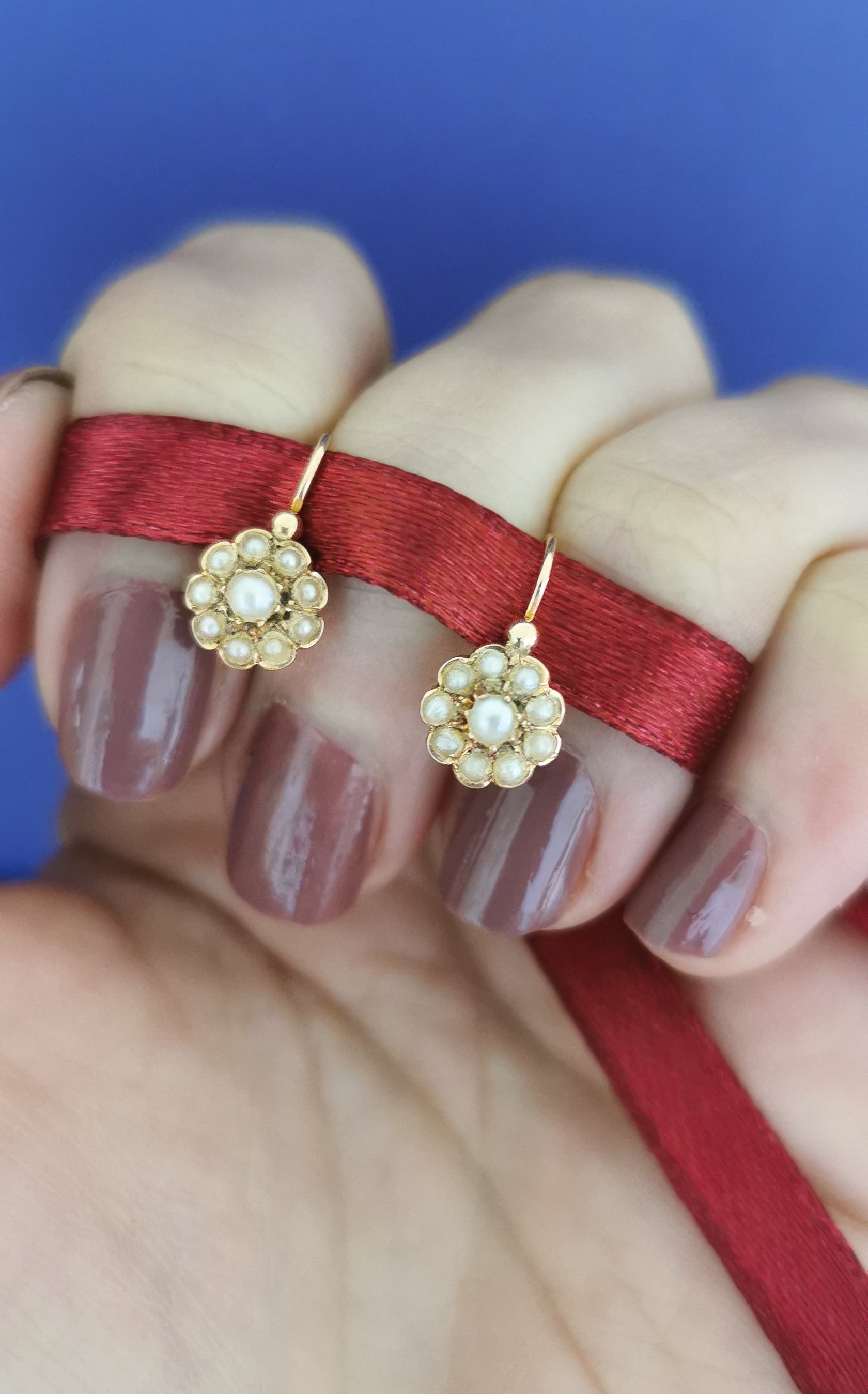 Breathtaking in person, the flower cut engraved on the sides and the back reflects the light beautifully and the design is enhanced by the seed pearls of the flower design. These special 1860's earrings are set in 18k Gold with a lovely floral frame holding 9 half natural pearls surrounding a centered bigger seed pearl on each pair. The lever back closes at the top, another mark of the era.