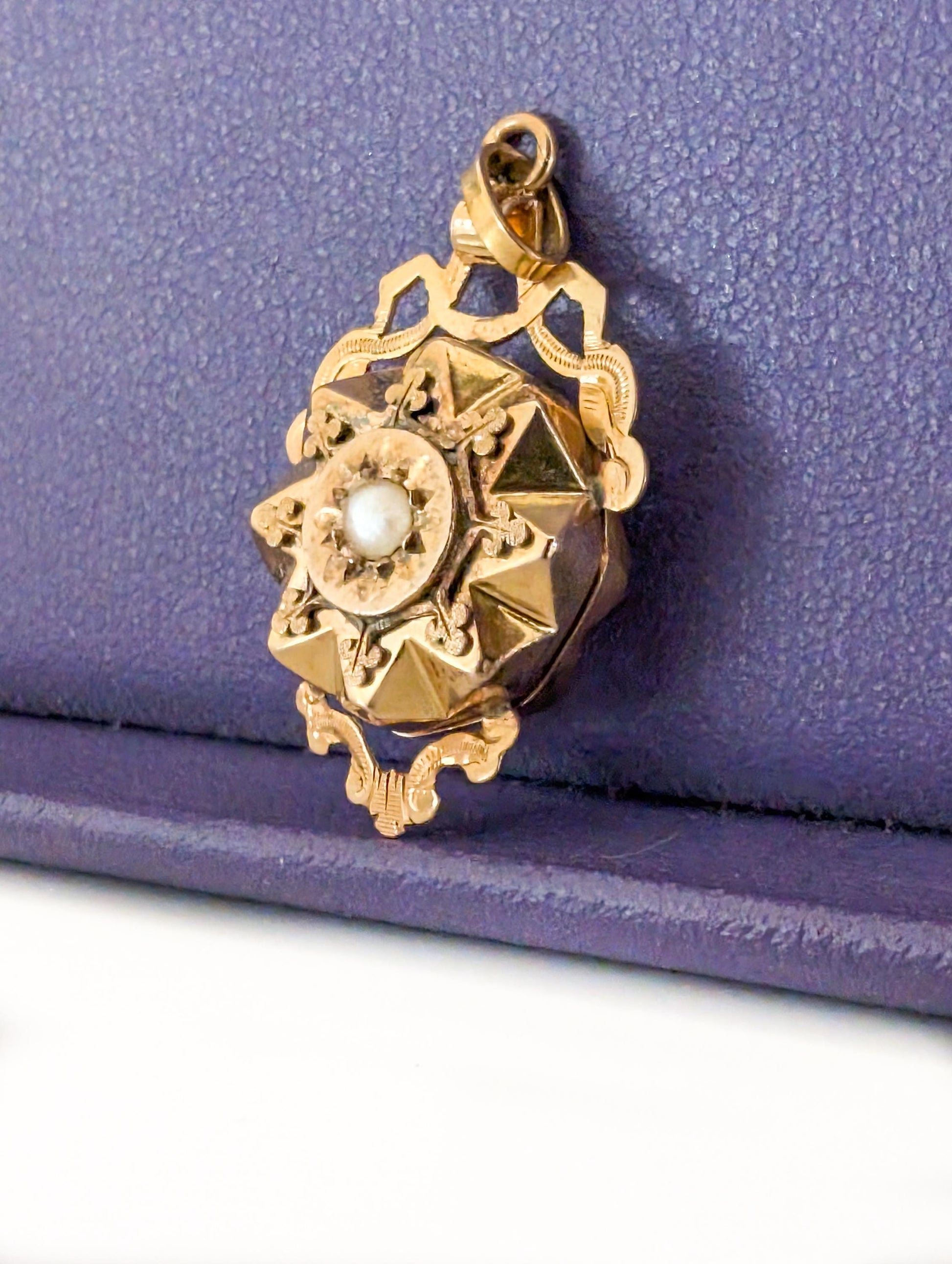 Indulge in the timeless allure of this Edwardian masterpiece – a truly exceptional piece of French Art Locket. Crafted from unique 18ct gold, this locket boasts an ornate design adorned with a natural seed pearl arranged in a flower shape at its center inside an engraved stardust design. The front showcases an engraved design, complemented by a decorative crown-like pattern that exudes a stardust charm. The reverse features beautiful small repeated patterns, adding to the overall elegance.