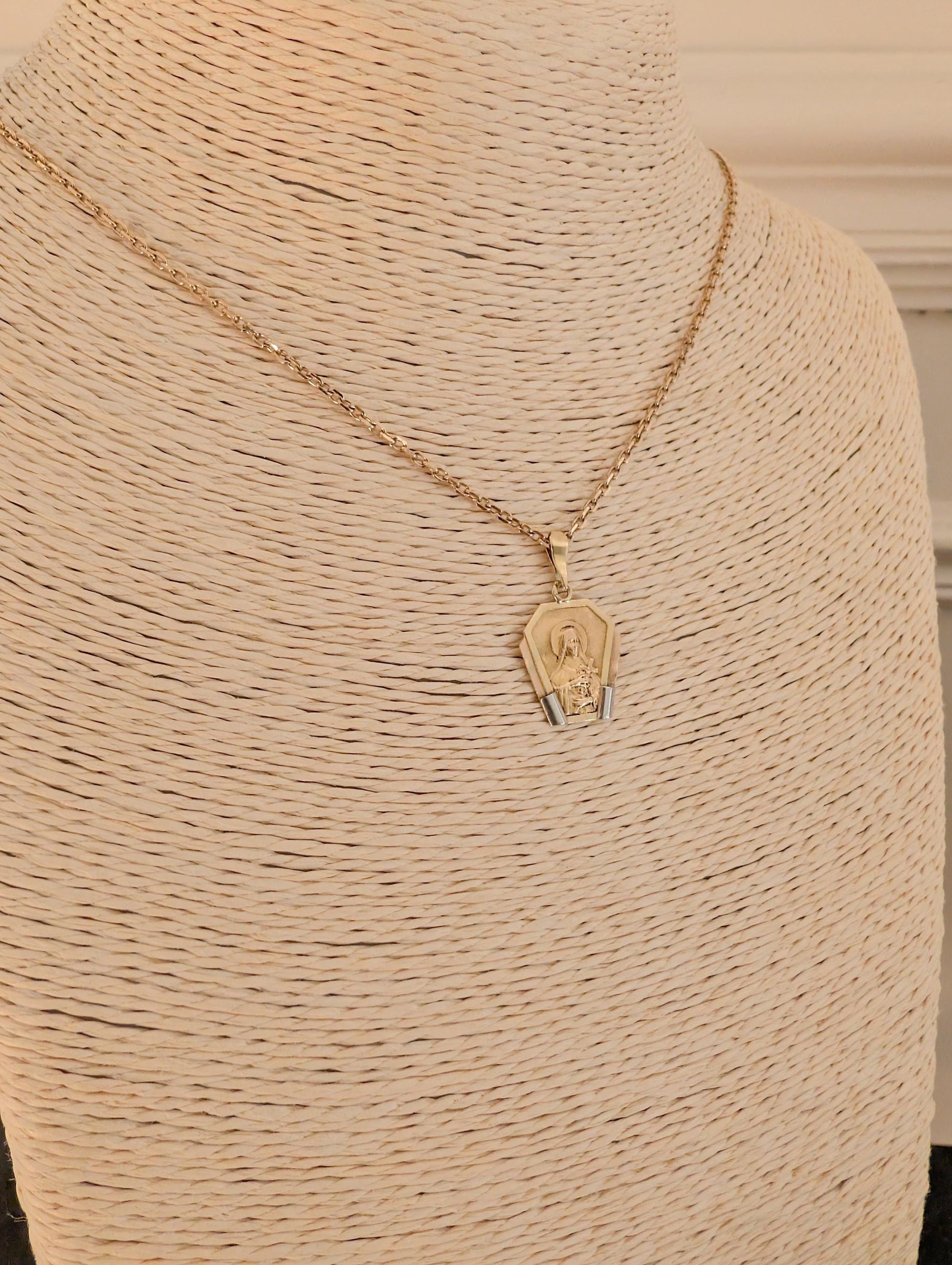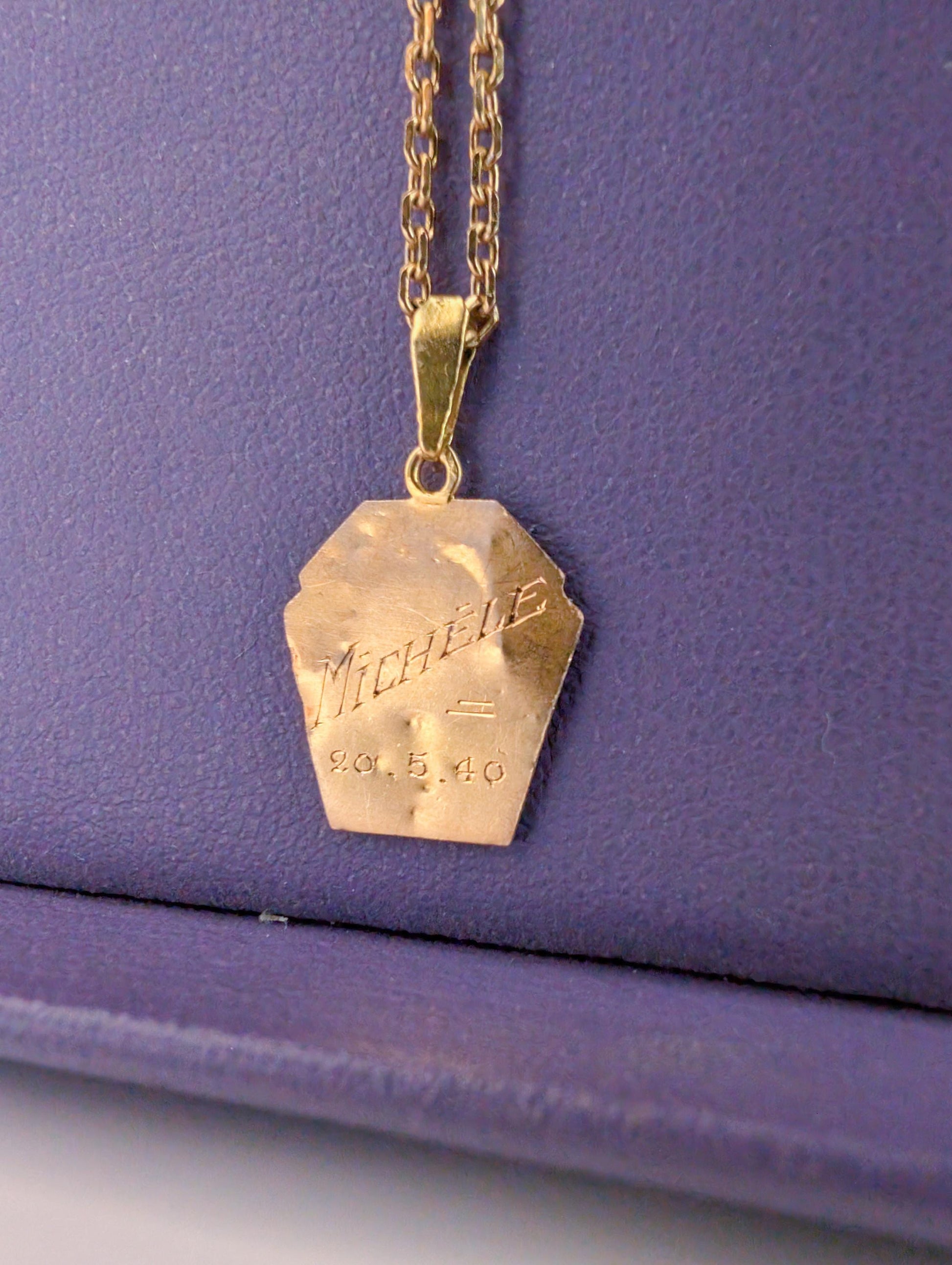 18K solid gold Delicate engraved medal of St Therese of Lisieux in a stunning Art Deco design. This French religious medal from the early 1930s, is made of 18K solid yellow gold. In the interior of the pendant, St Therese is visible facing us, delicately sculpted in the center of gorgeous Geometrical frame. She holds flowers and a cross. The reverse is engraved with the name Michele and the date 20.05.40.