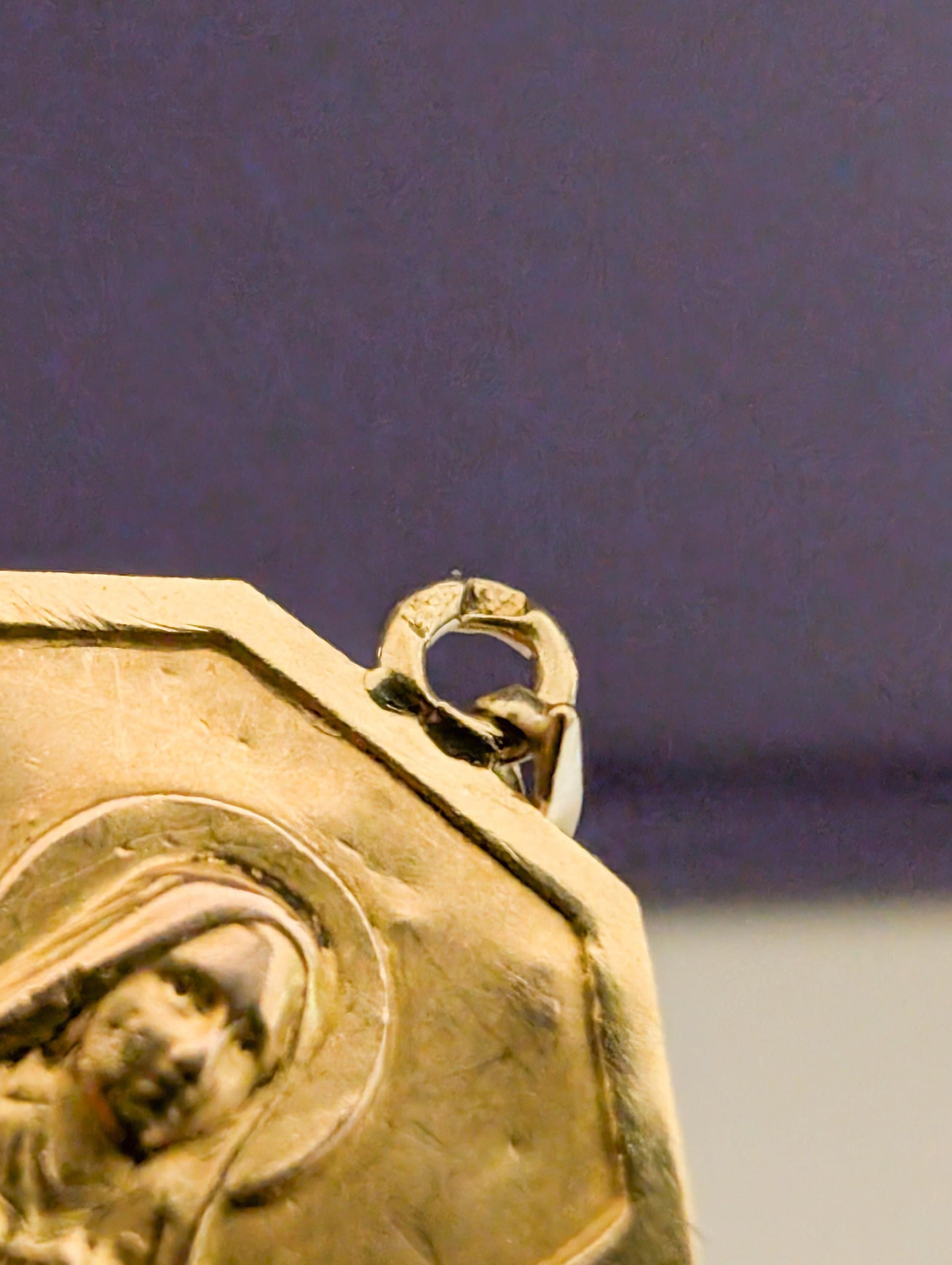 The medal is thin but in relief. Lovely small details abound on this gorgeous religious medal.