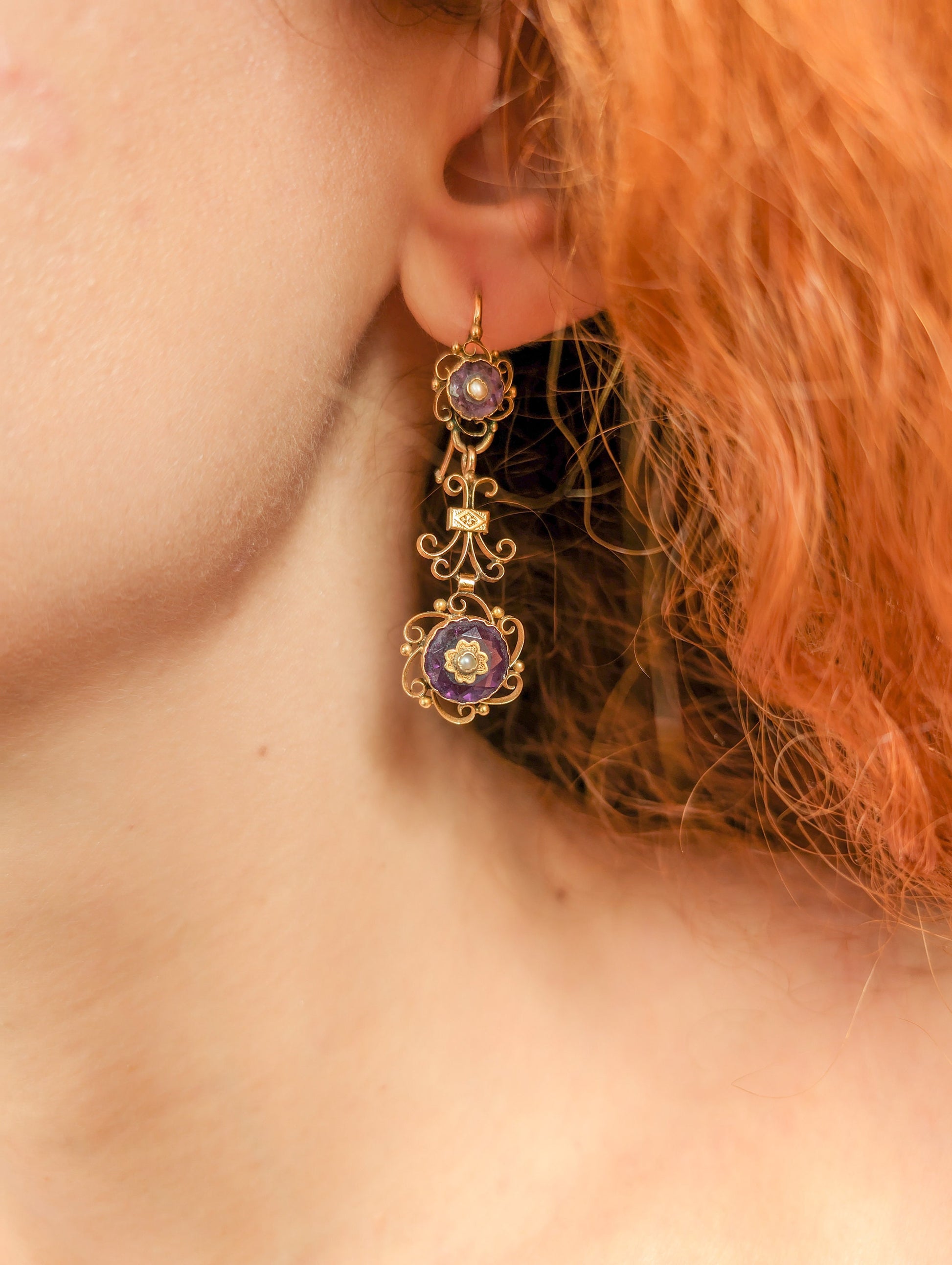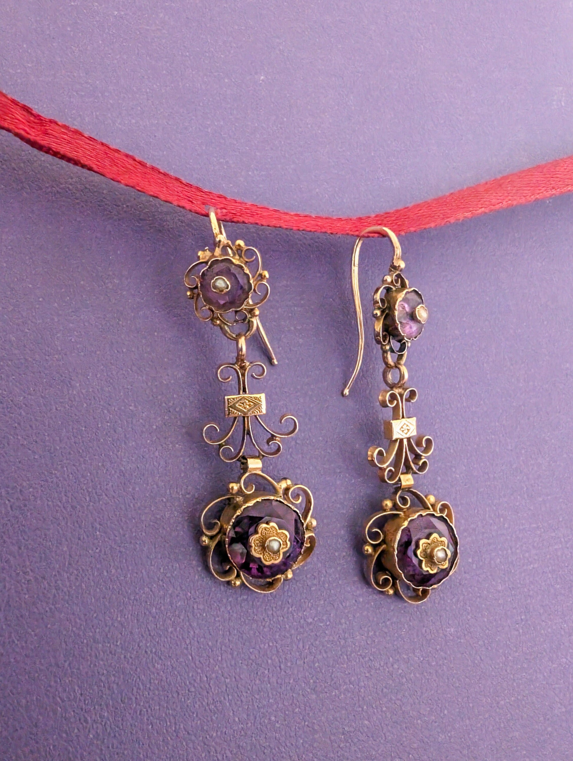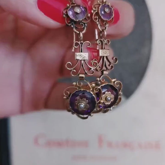 18K Gold Victorian Amethyst Dangle Earrings with Pearl