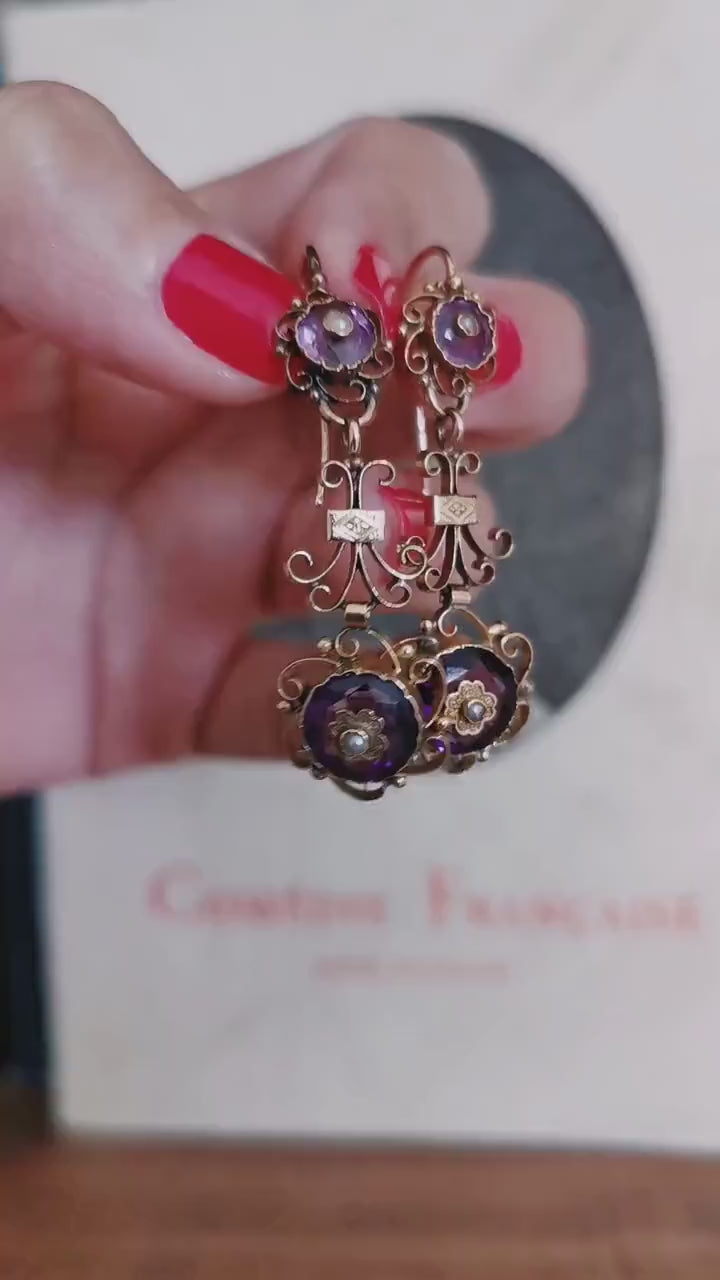Big 18K Gold Antique Amethyst Earrings Antique Dangle earrings Victorian Earrings Gold Earrings with Pearl 18K Gold Earrings gift for her