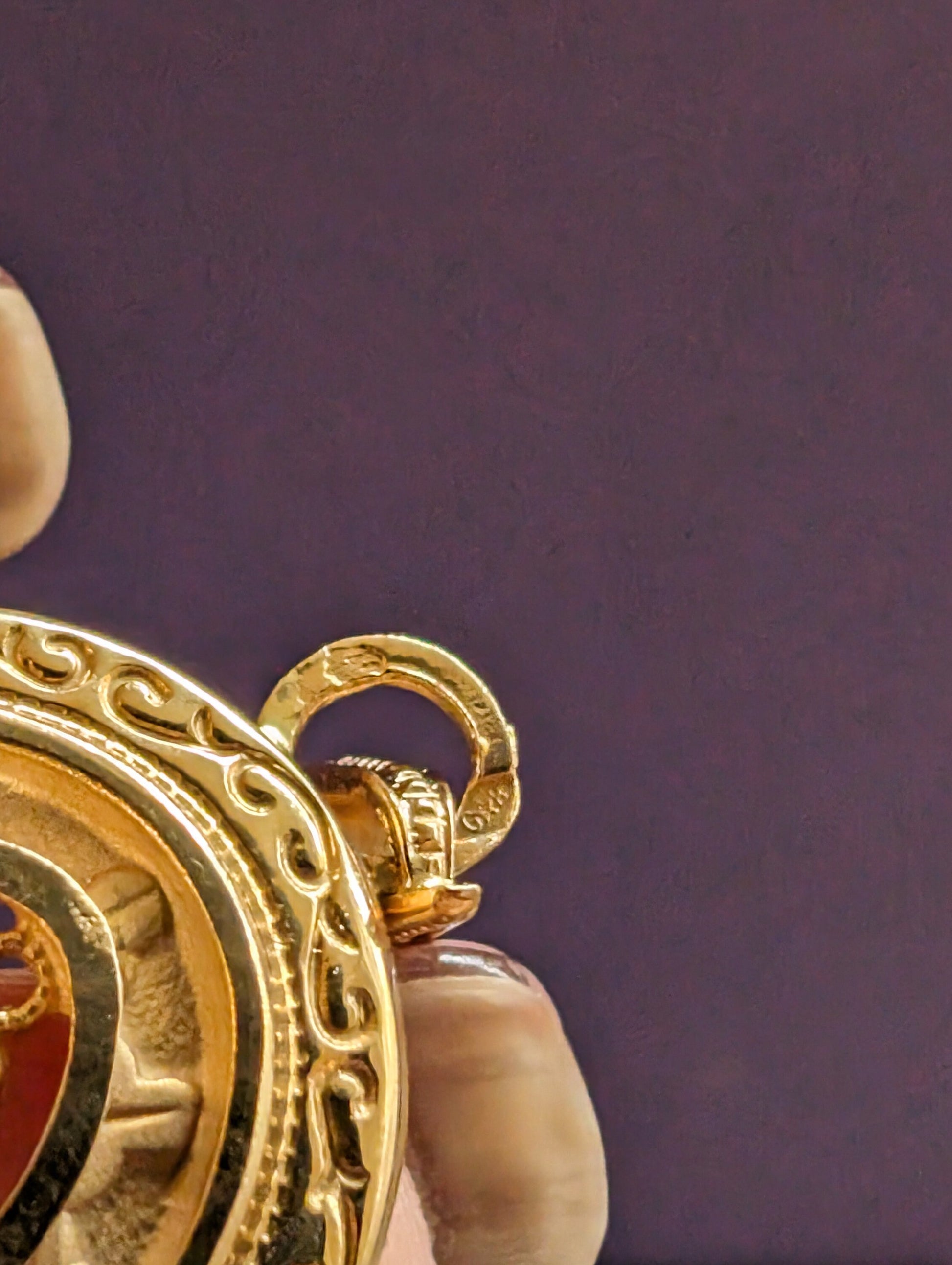 The centerpiece of this pendant is a well-preserved garnet, delicately encased within a filigree design that resembles a cross, featuring two heart-shaped sides. The play of light on this pendant reveals different layers of gold, each adorned with intricate engravings that add to its opulence.