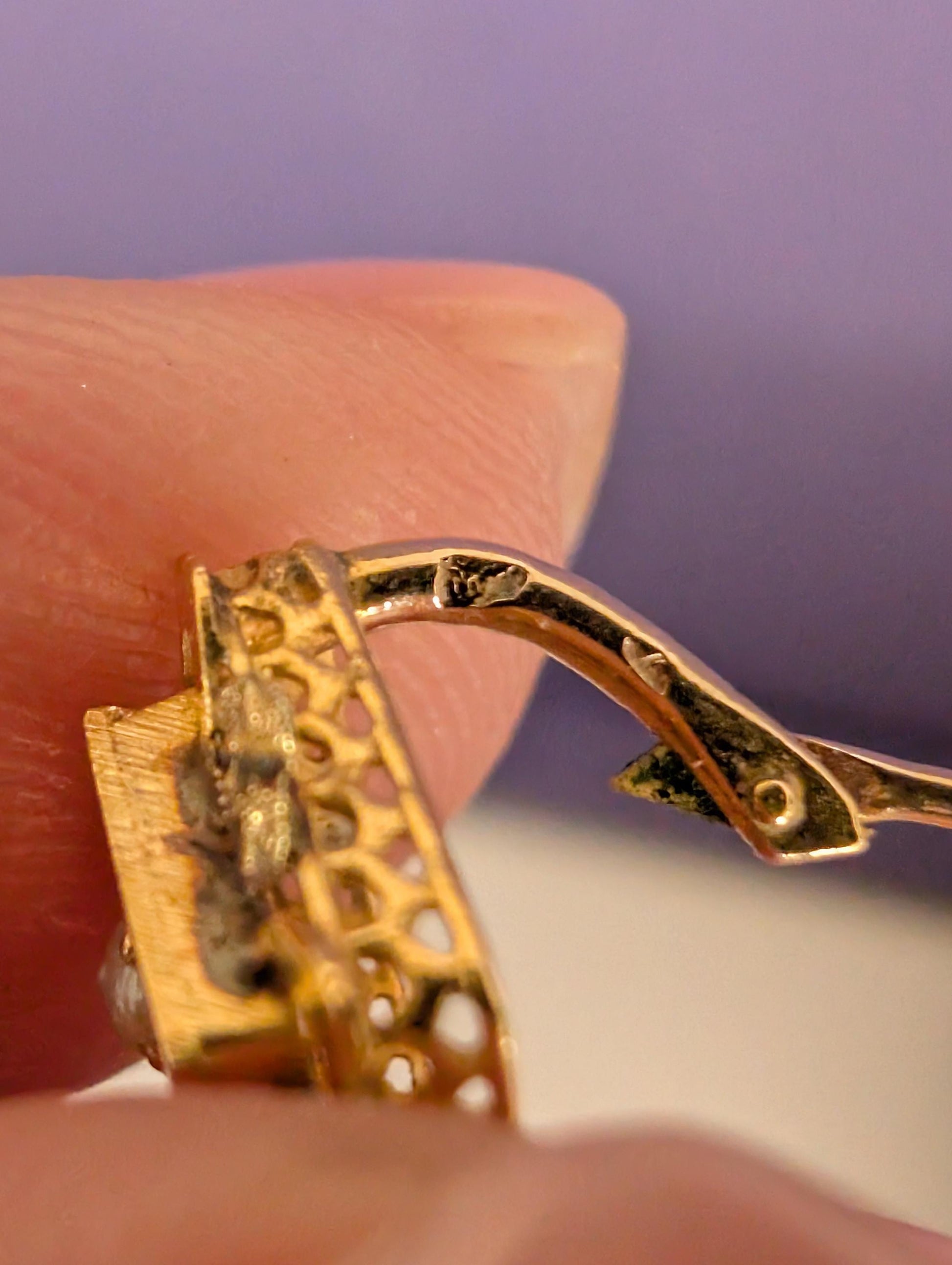 Further enhancing their regal aura, the sides of the earrings showcase the different layers. The lever back closure, characteristic of the era, secures them with ease and precision.