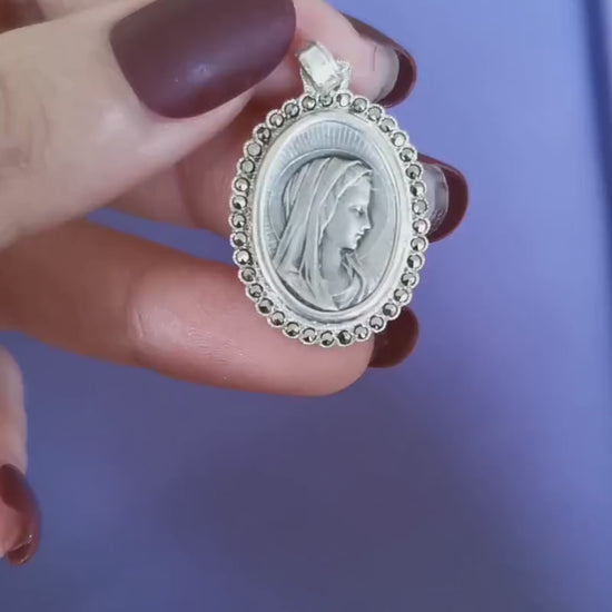 1900s Art Nouveau Virgin Mary Pendant with marcassites stones Unique Silver virgin Mary Medal French religious medal Gift for Her