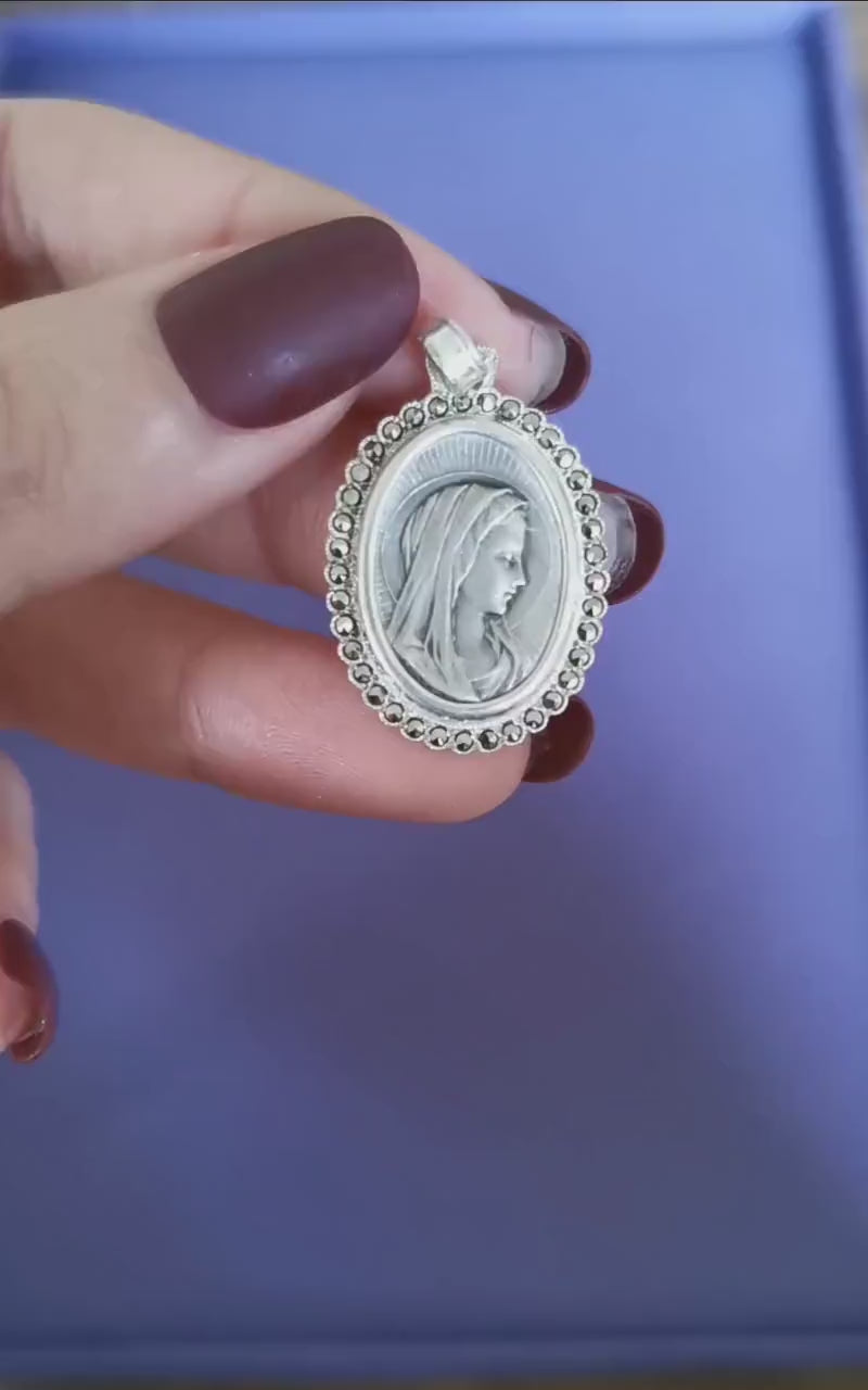 Delicate silversmith art work in a unique oval shape, this French religious medal is one of a kind. From the 1900s, it is made of thick and high quality silver. In the interior of the pendant, the Virgin is visible in profile, delicately sculpted and facing right with a beautiful face that warms hearts. The virgin has a vail and is surrounded by delicate relief with a sun surrounding her head and light rays The reverse is smooth. What makes it unique is the frame surrounding the center all set with 36 marcassites stones, the bail is itself sculpted and hold a marcassite.