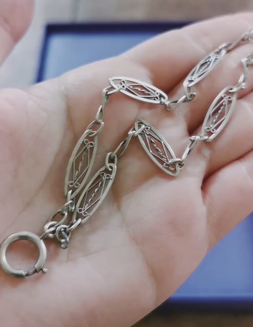 In terms of condition, this vintage bracelet is in excellent shape. While it may exhibit some very light tarnish, this is not visible when worn and can be easily removed over time with a silver bath and gentle polishing. The swivel clip clasp and spring ring closure ensure a secure fit, and the clasp simply requires a gentle push to close perfectly.
