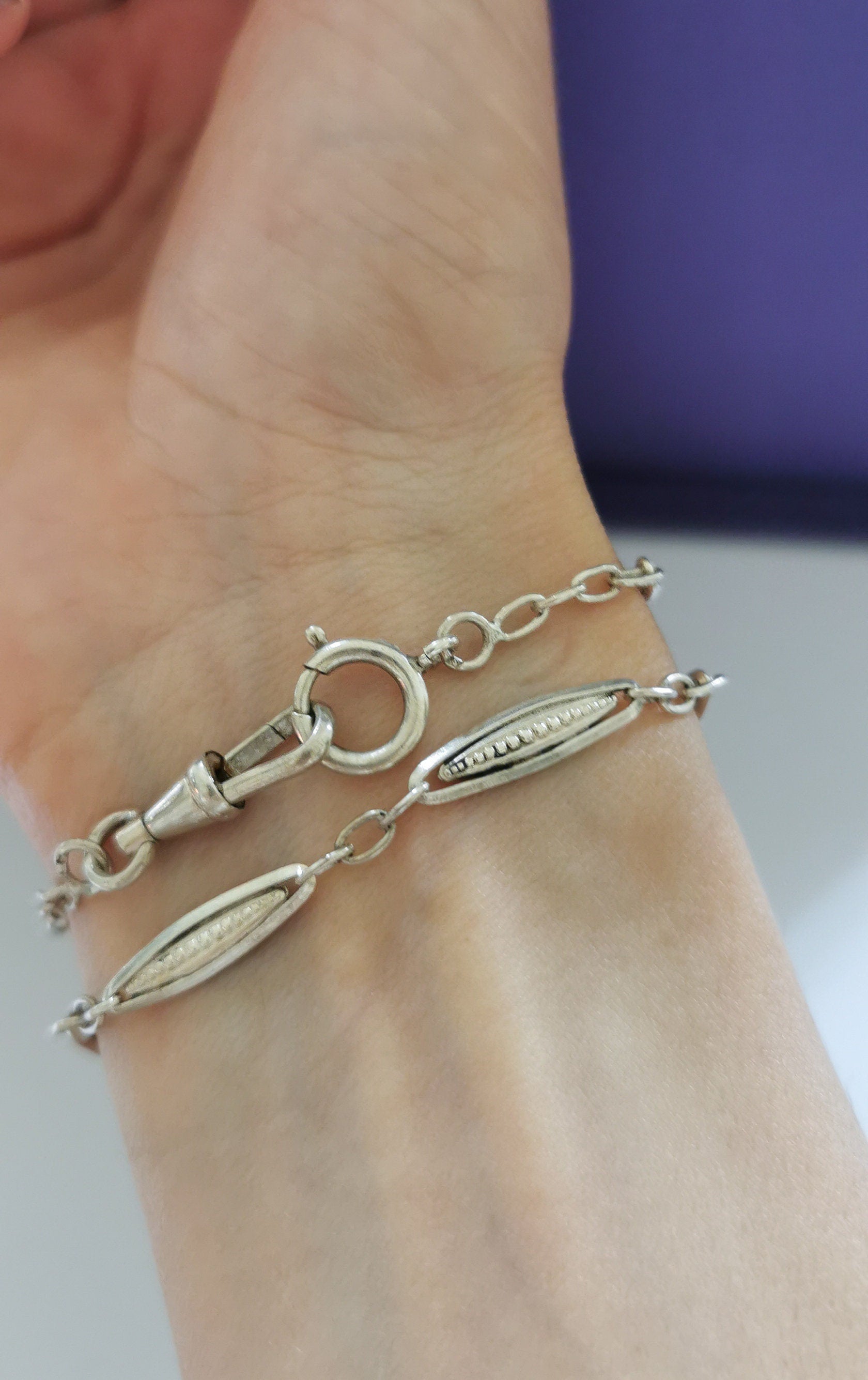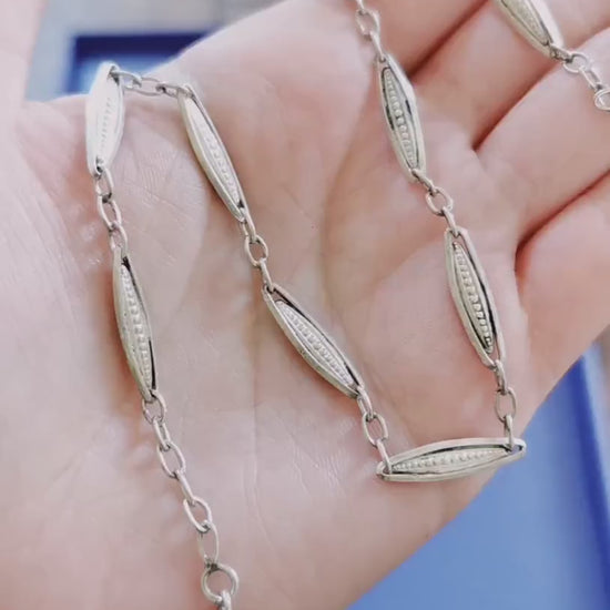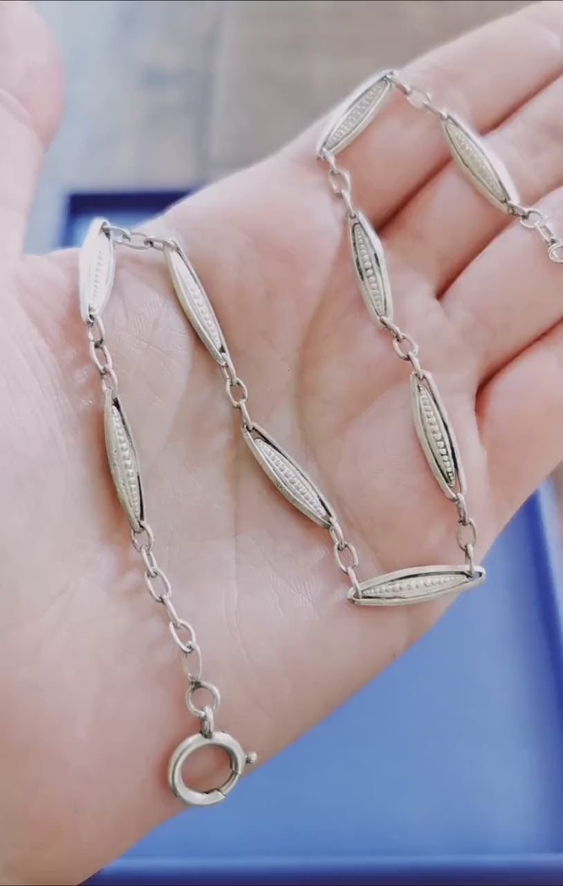 Unique French Art Deco Watch Chain from the 1930s, transformed into a unique silver bracelet of exceptional beauty. Crafted with meticulous attention to detail, this bracelet features a series of 9 oval links, each adorned with intricate relief ball designs at its center. Originally designed for watch attachment, it has been repurposed into a captivating accessory that can be elegantly wrapped twice around the wrist. I'd recommend using this double bracelet for a small wrist like mine.