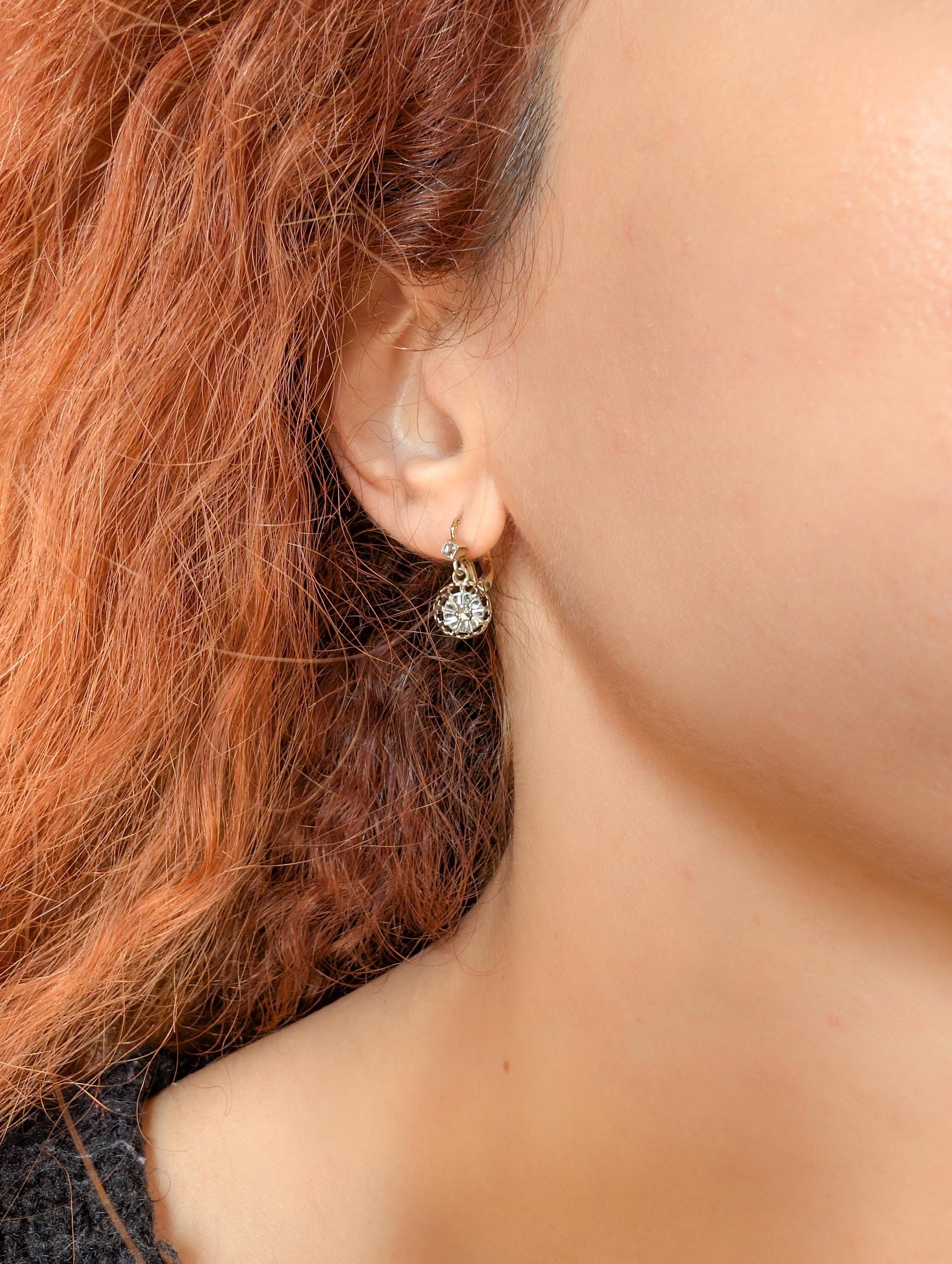 The unique two-tone design features a rich yellow gold structure paired with a front and trembling part made of white gold, which makes the diamonds appear even more luminous. This combination of goldwas skillfully crafted to create a perfect harmony between light reflection and elegance. These earrings are known as "sleepers" due to their comfortable, secure design, ideal for extended wear, even while sleeping.