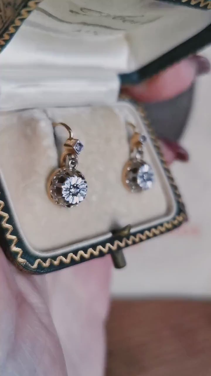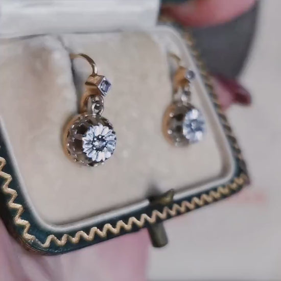 These exquisite 18K gold and diamond earrings are a breathtaking example of French Art Deco craftsmanship from the 1930s. Each earring is beautifully composed, with a delicate rose-cut diamond at the top, followed by a larger diamond of approximately 2.5mm in diameter, set in a trembler design that maximizes movement and sparkle. The crown-like, trembling lower section is meticulously crafted in white gold, which enhances the brilliance of the diamonds and provides a striking contrast to the warm yellow gold.