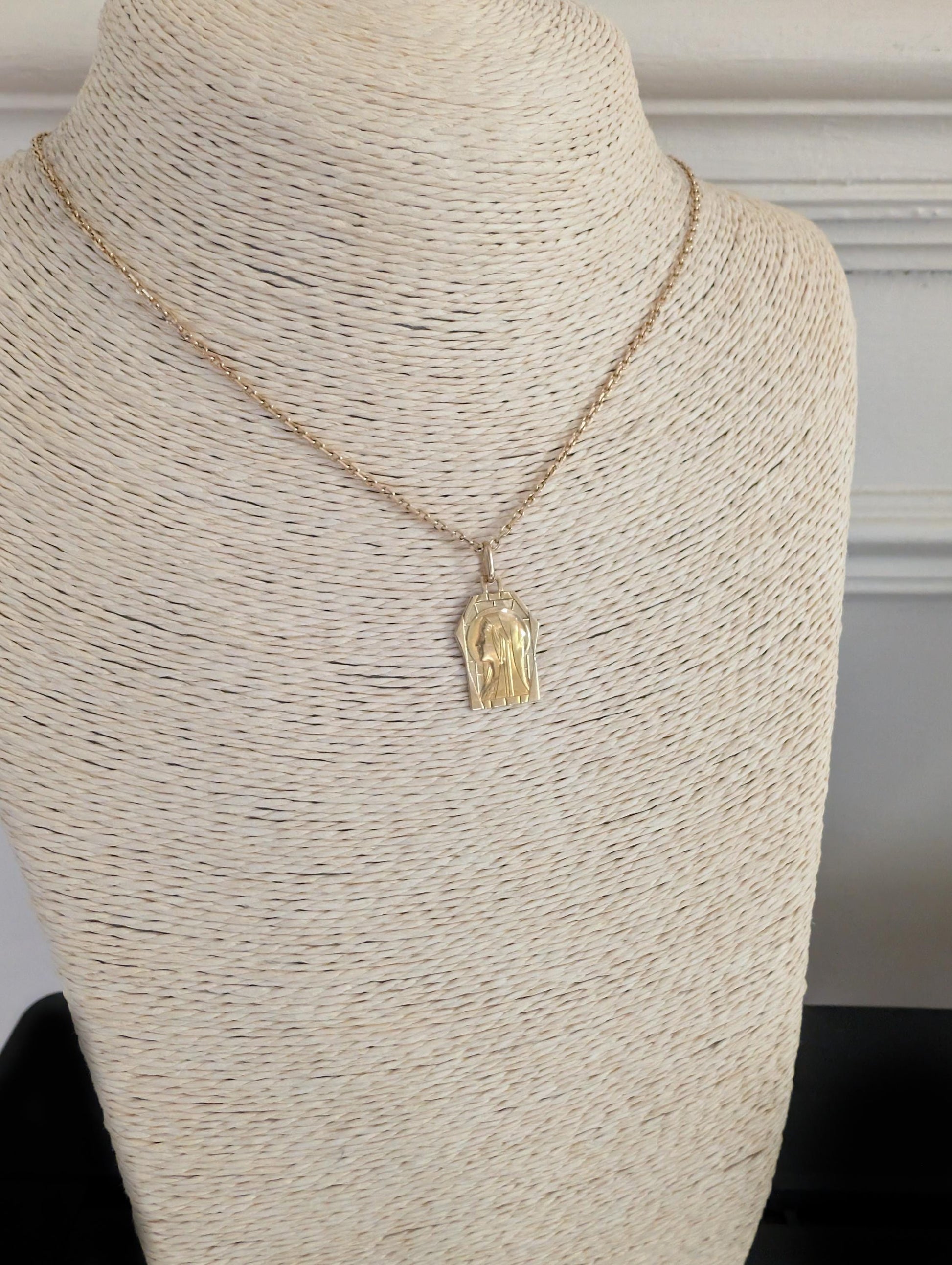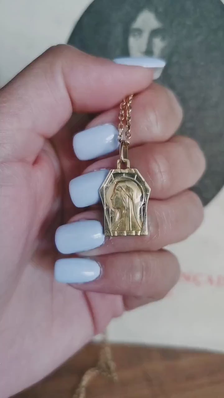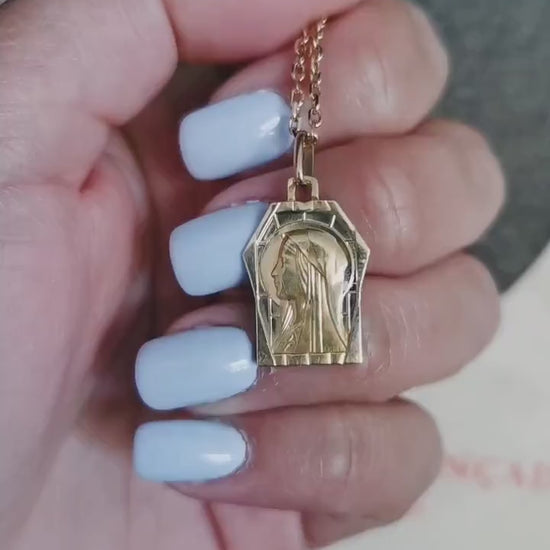 1930s Art Deco 18K Gold Virgin Mary Pendant: Antique French Religious Medal