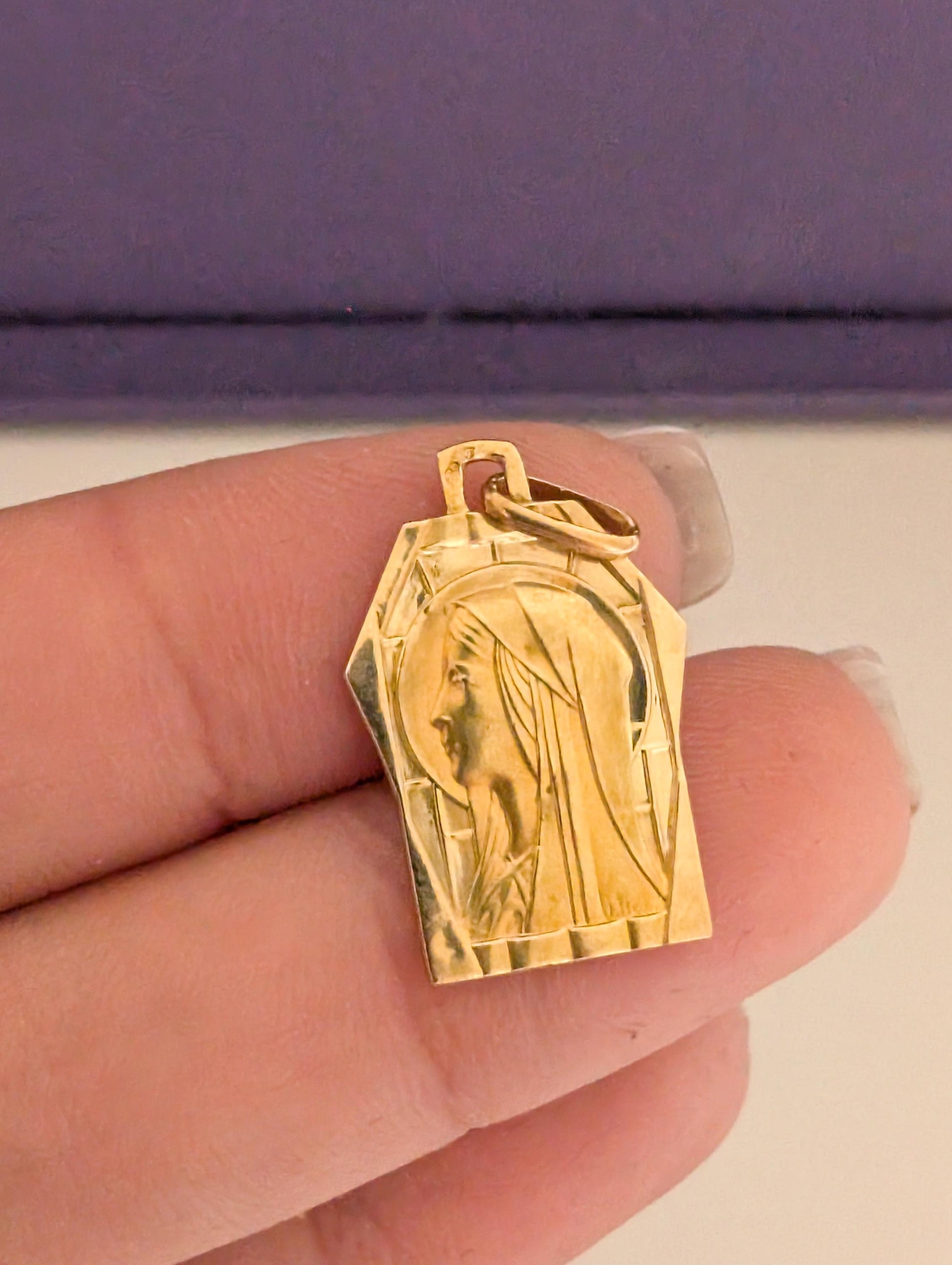 Astonishing 1930s powerful 18K solid gold Art Deco Virgin Mary Gold Pendant, an absolute piece of art, this antique French Religious Medal exudes grace and reverence. Crafted from solid 18K yellow gold and marked with an eagle head, symbolizing its 18K gold purity, a hallmark of authenticity.