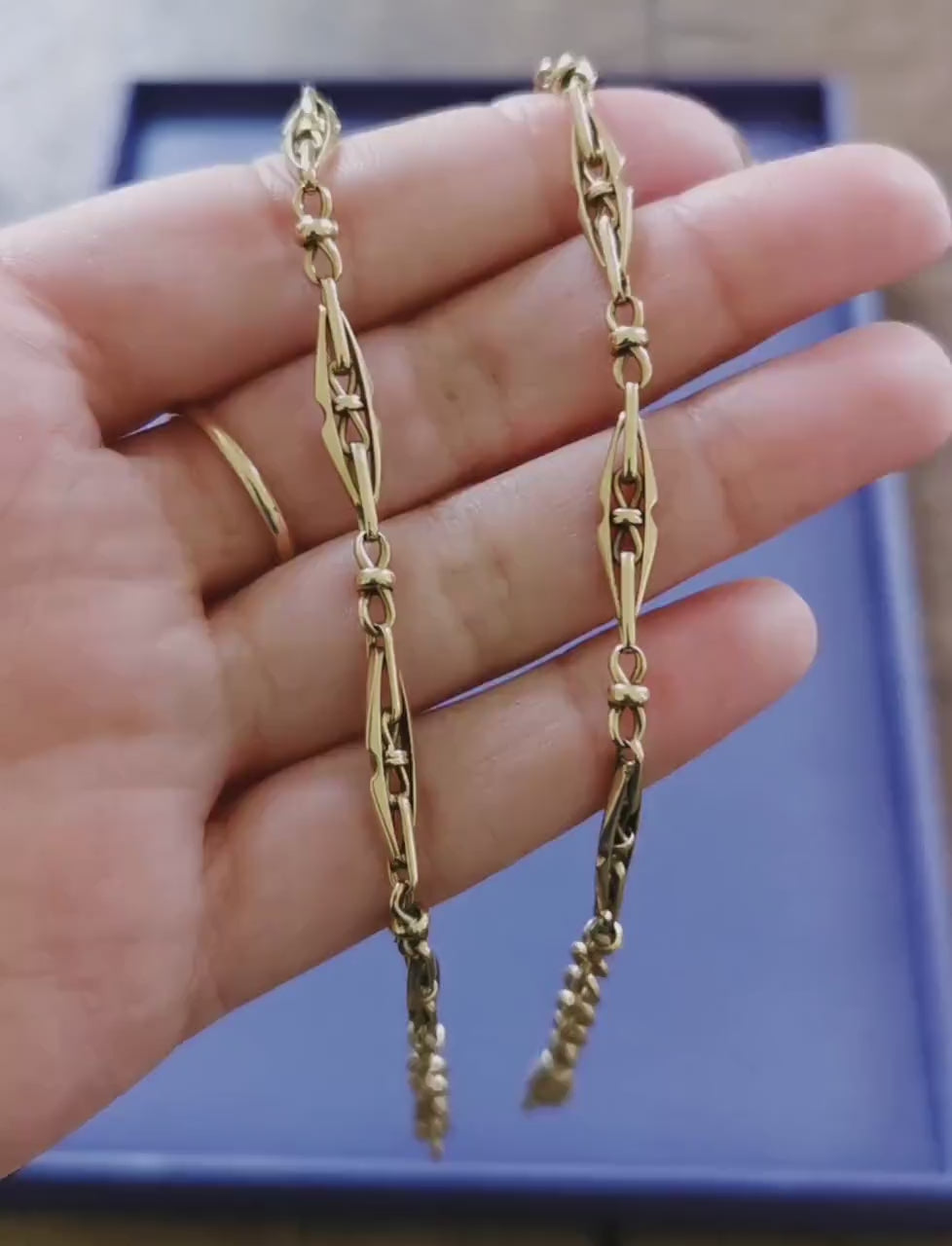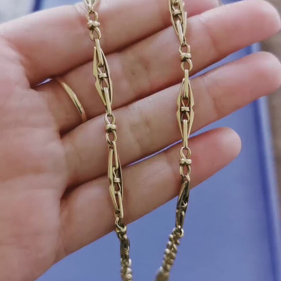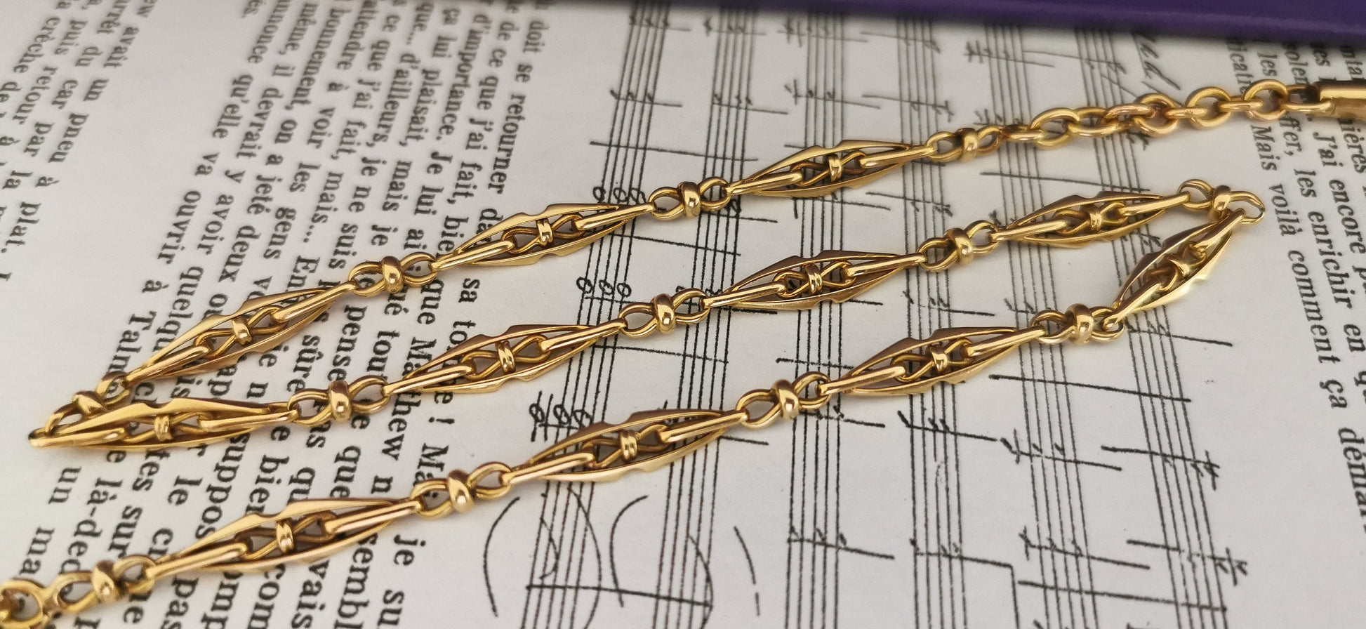 1890s Astonishing French Edwardian antique 18K gold chain, exuding elegance and sophistication. This exquisite piece, crafted by a talented goldsmith, showcases 11 oval bow-like links. At the center, a delicate bow with a unique design is surrounded by arches, connected by bow links and trace chain. This wonderful chain has been transformed into the most perfect choker, so please ensure it fits comfortably around your neck.