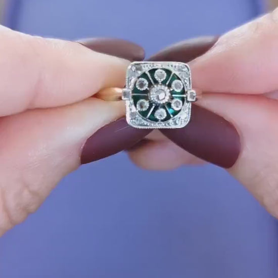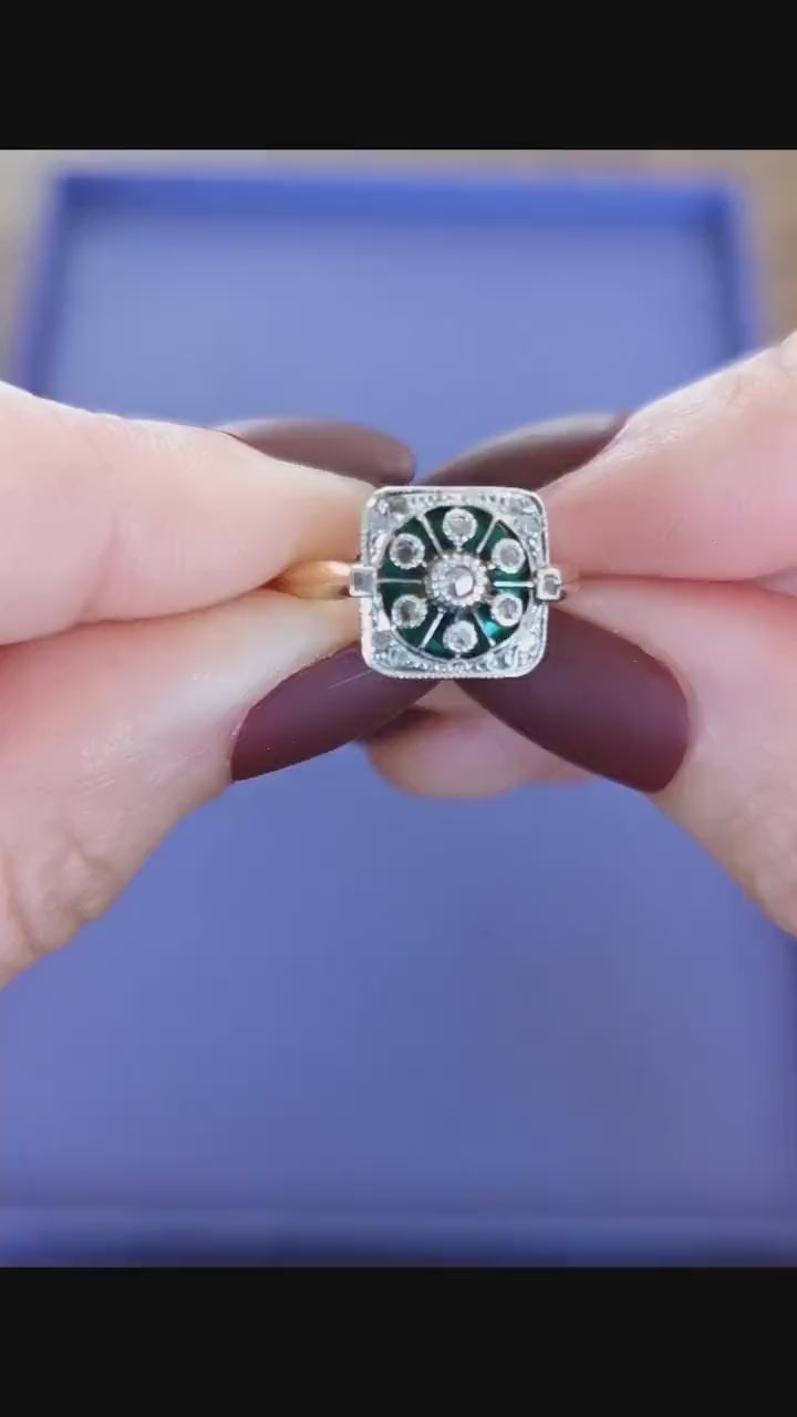 The ring is centered by a White gold floral design more looking like a star sky plan to me holding a bigger diamond surrounded by . inside a white gold circle. The star center carries a bigger rose cut diamond surrounded by 6 smaller rose cut diamonds. This work of Art is itself surrounded by a green enamel work in excellent condition inside the ring. All of thr setting surrounded by white gold inside which you can find 2 diamonds on each of the 4 sides which makes a total of 8 more rose cut diamonds. ever the less the two sides where the band does reach has 2 diamonds. Which makes a total of 17 rose cut diamonds.
