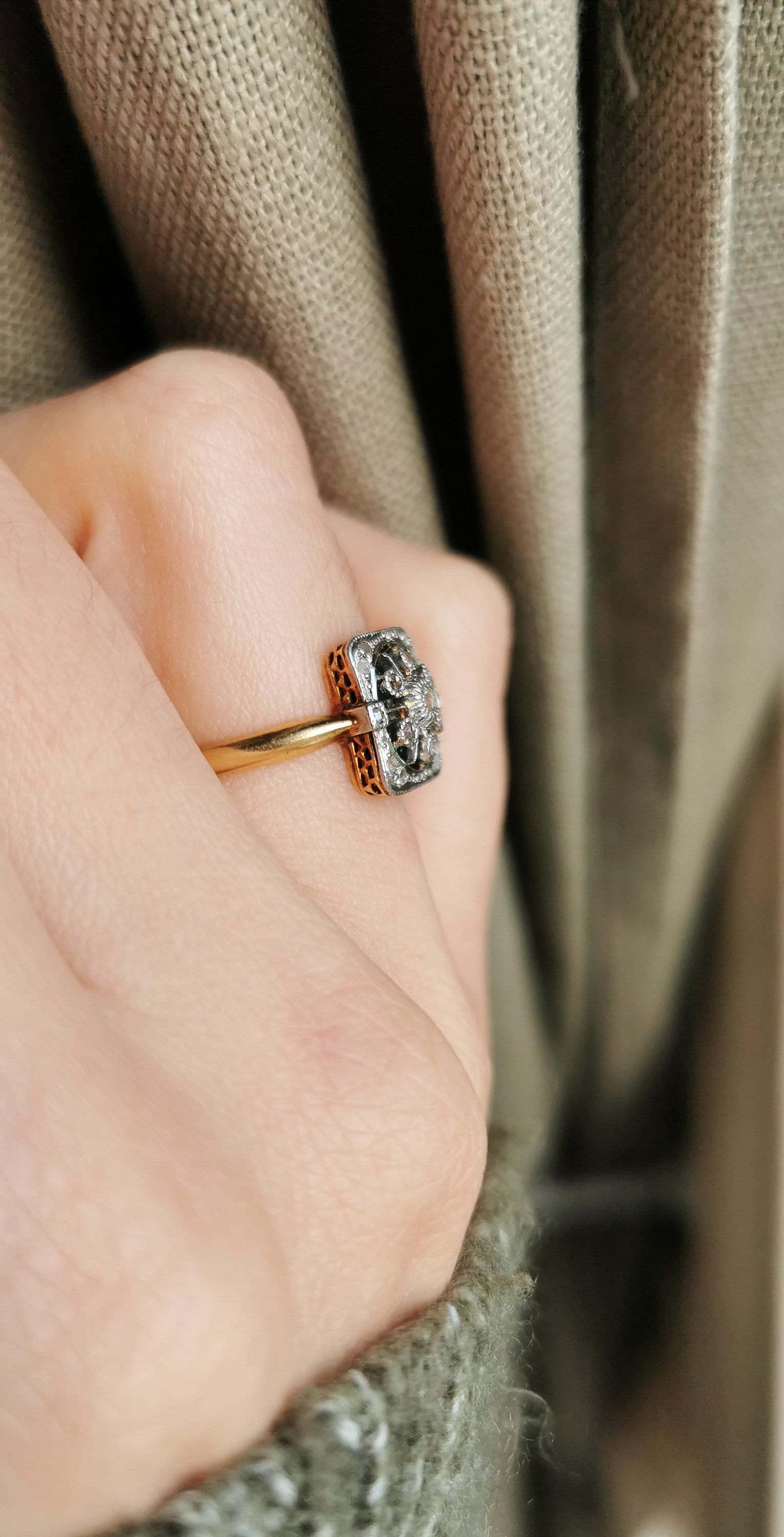 The French Art deco ring you can never stop staring at. This luxurious and romantic Art Deco Ring is made of 18 ct yellow Gold setting. The top is made of yellow and white gold. The setting sides have grown through time giving it a rose gold patina with triangle and half circle engraved design.