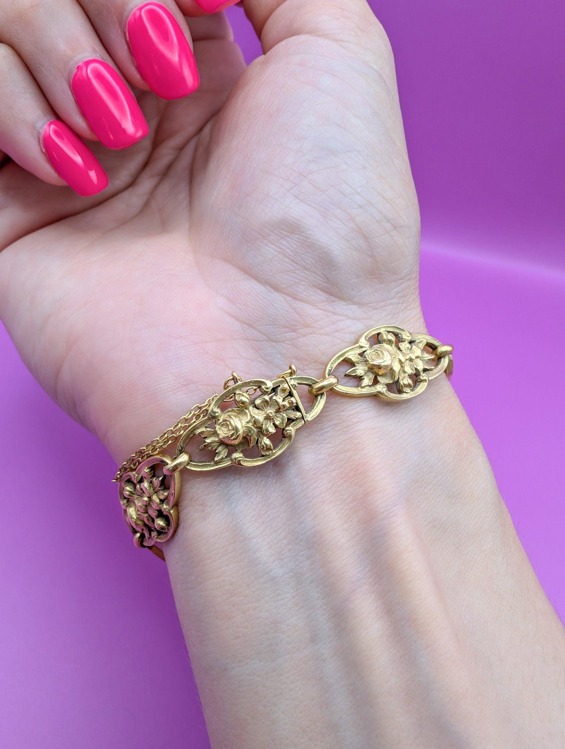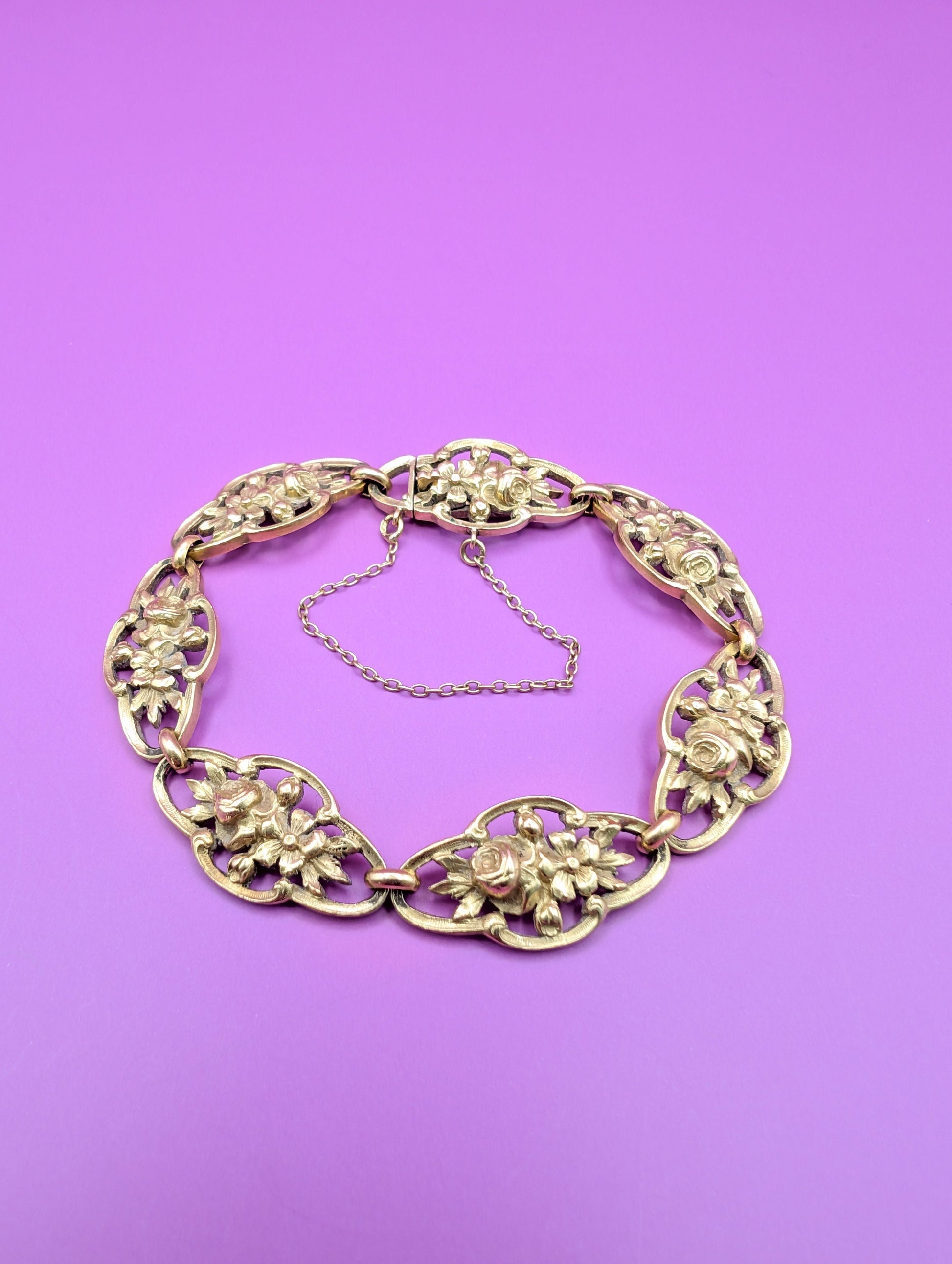 Luxurious Art Nouveau thick bracelet from the early 1900s heavy in gold with a weight of 21gr. This stunning piece is composed of seven exquisite links, elegantly separated by trace chain. The bracelet is accompanied by a security chain, which not only enhances its beauty but also provides added security. It closes with a clasp formed by 2 parts of one of the links visible in pictures. The bracelet is in excellent antique condition all the links are strong and the floral design in relief really makes this one stand out, the borders are slightly engraved.