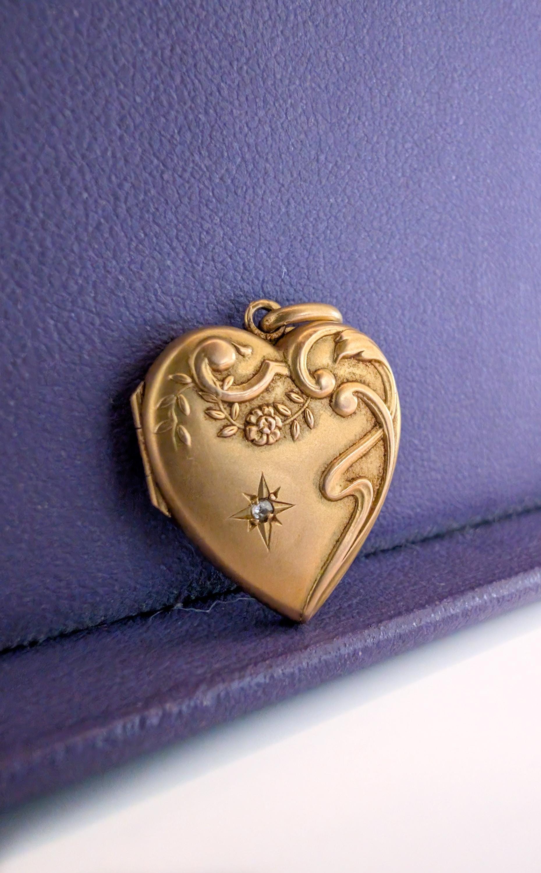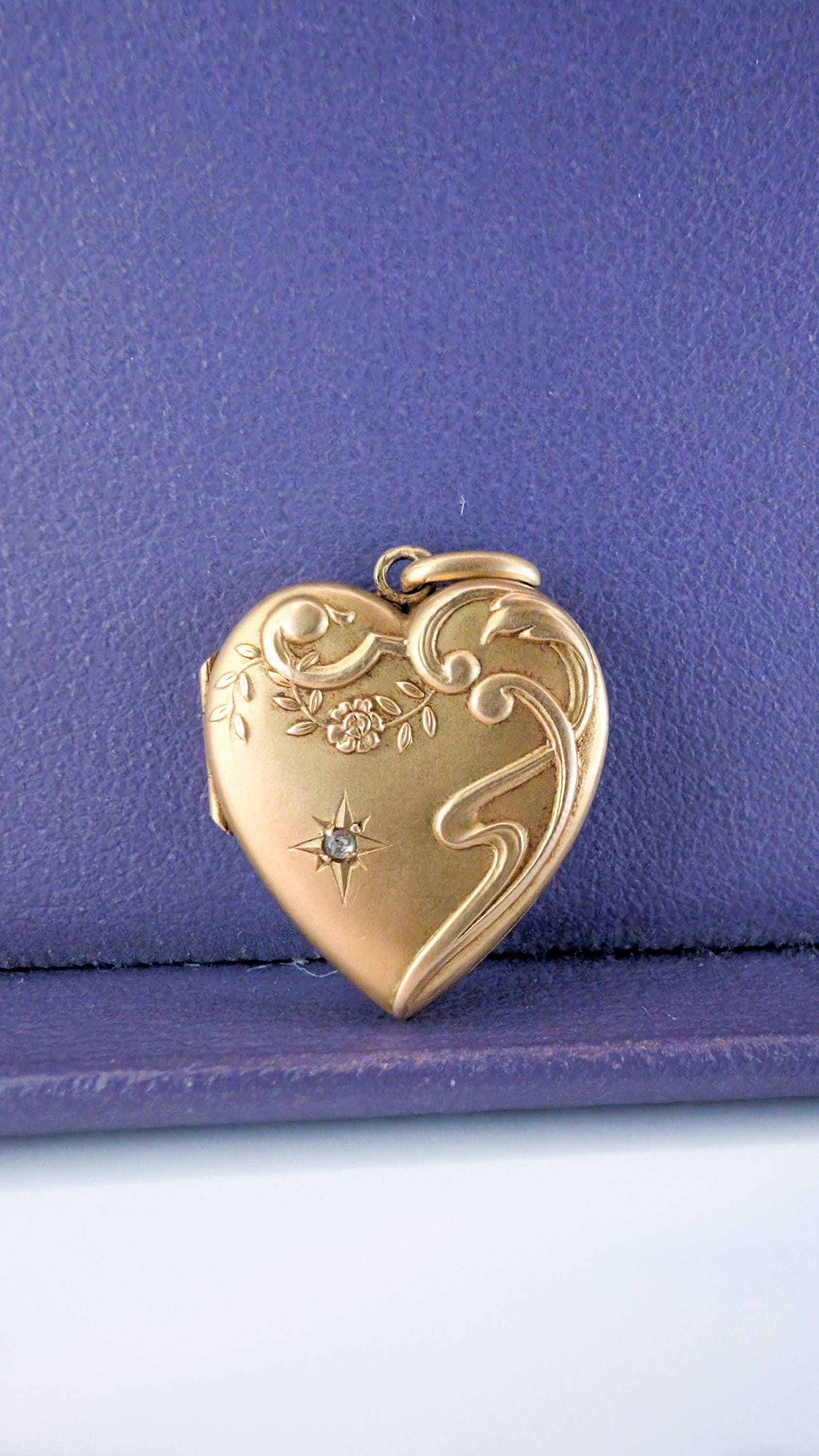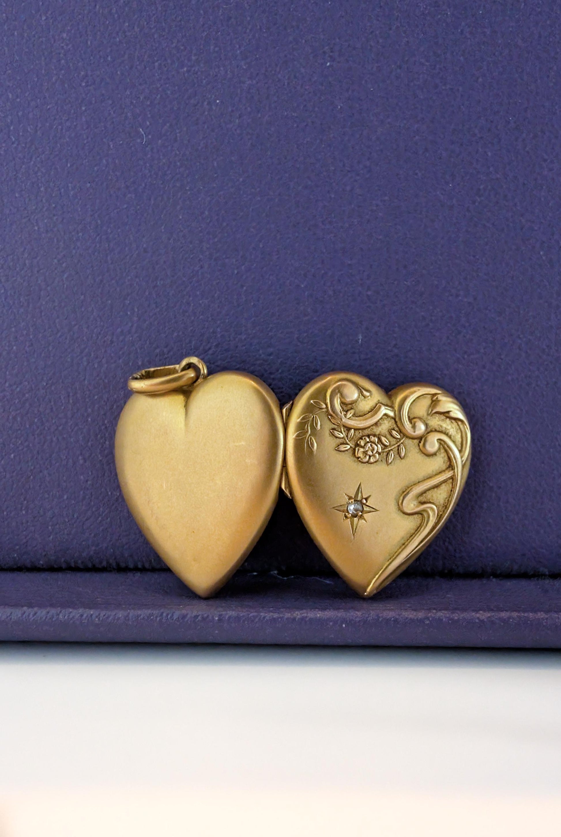 Antique 18K Gold Heart Locket Pendant, Art Nouveau Diamond
