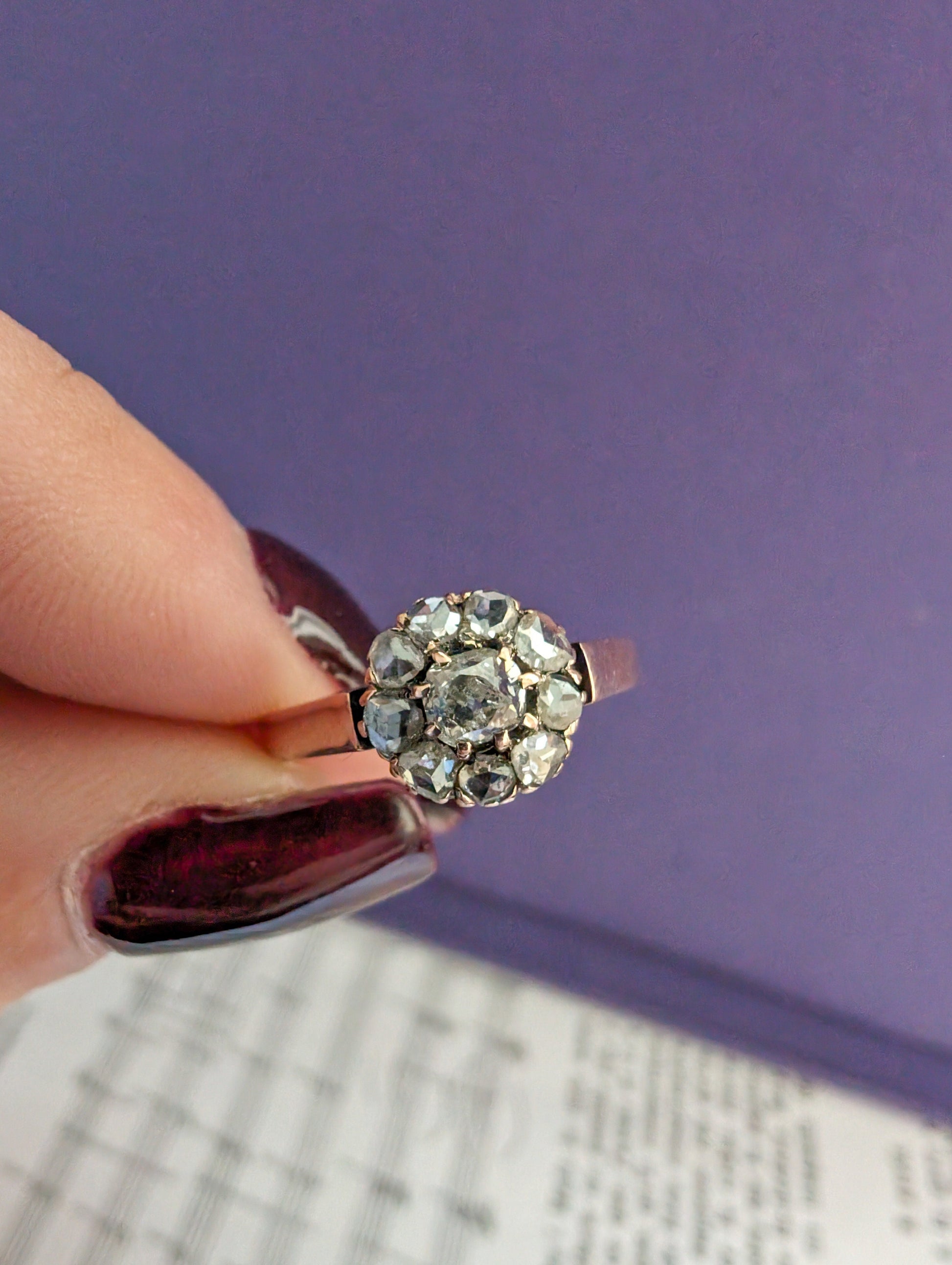 Antique Edwardian 18K Rose Gold Diamond Daisy Cluster Ring