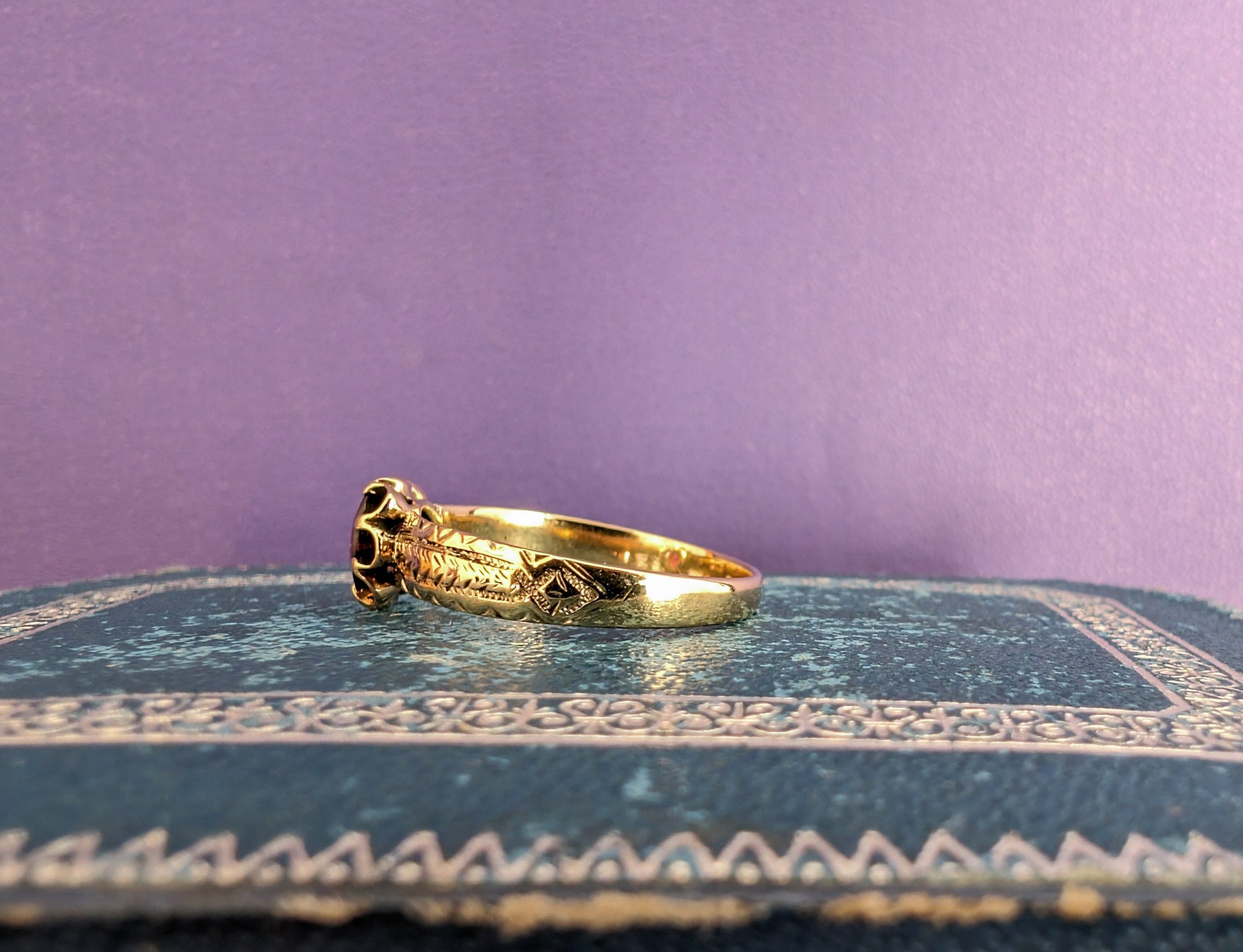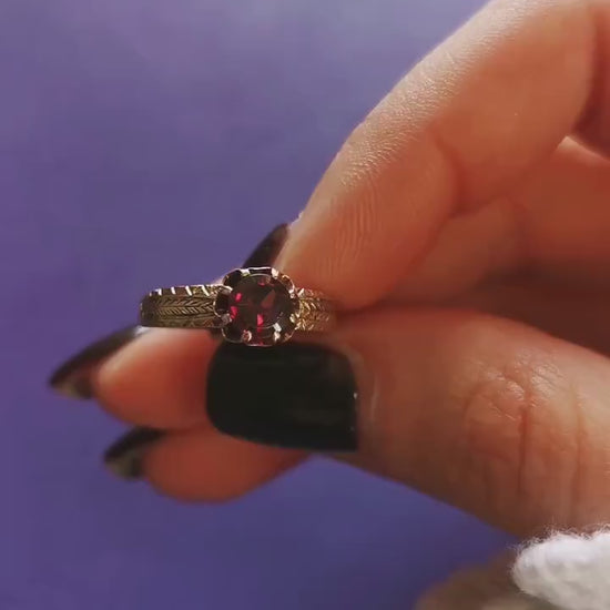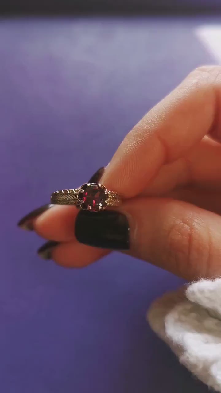The ring is centered by an approx 0.7 cm diameter radiating purple crystal that resembles a garnet that changes from dark to poping purple depending on the light. This ring is from the 1850s from the French Napoleon III period which corresponds with the victorian period. It is marked by an eagle head hallmark. The setting has a floral shape and is engraved in a luxurious way.