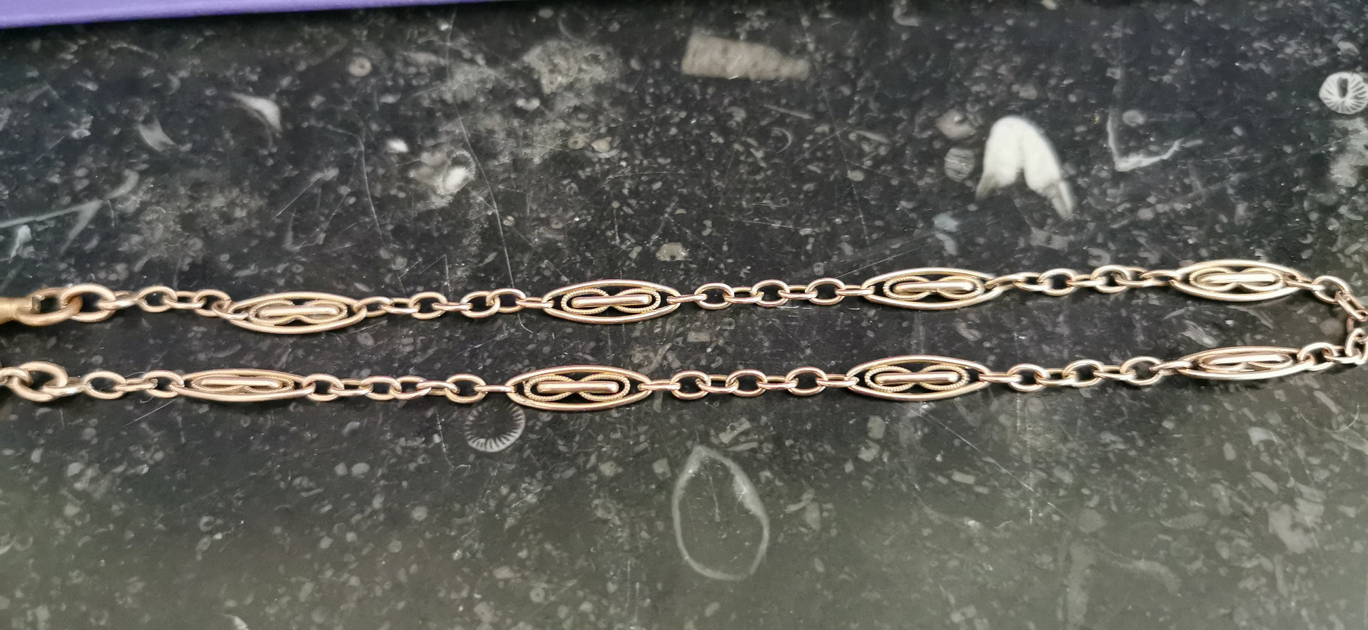 Unique Late Victorian chain with dog clip clasp and spring ring. Made of thick and high quality rose gold fill, which is a layer of 18k gold over brass or other base metal. Height unique segments in rose gold and copper held together by round links. Originally used to clip a pocket watch to your jacket, now makes a lovely bracelet (wrapped twice) or necklace. Please check the length as it is small compared to a modern chain. In good antique condition with some gold fill loss on the dog clip clasp giving it a copper color, some light tarnish inside the filigree parts not visible when worn. The chain links are in excellent condition, very shiny, with a lovely rose gold color.