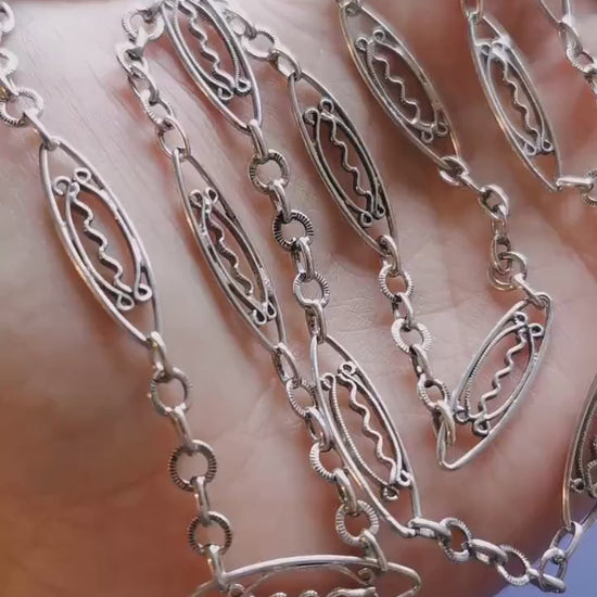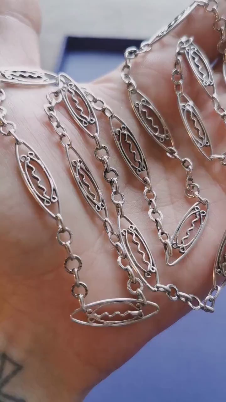 In excellent antique condition, this necklace showcases its remarkable preservation, with each chain link radiating a brilliant shine and preserving its lovely design. While some light tarnish may remain and some oval links slightly torn (won't be noticed when worn), a gentle polish or silver bath will restore its original luster over time, ensuring its timeless beauty endures. We already did polish it but kept a slight patina as it enhances the engraving patterns.