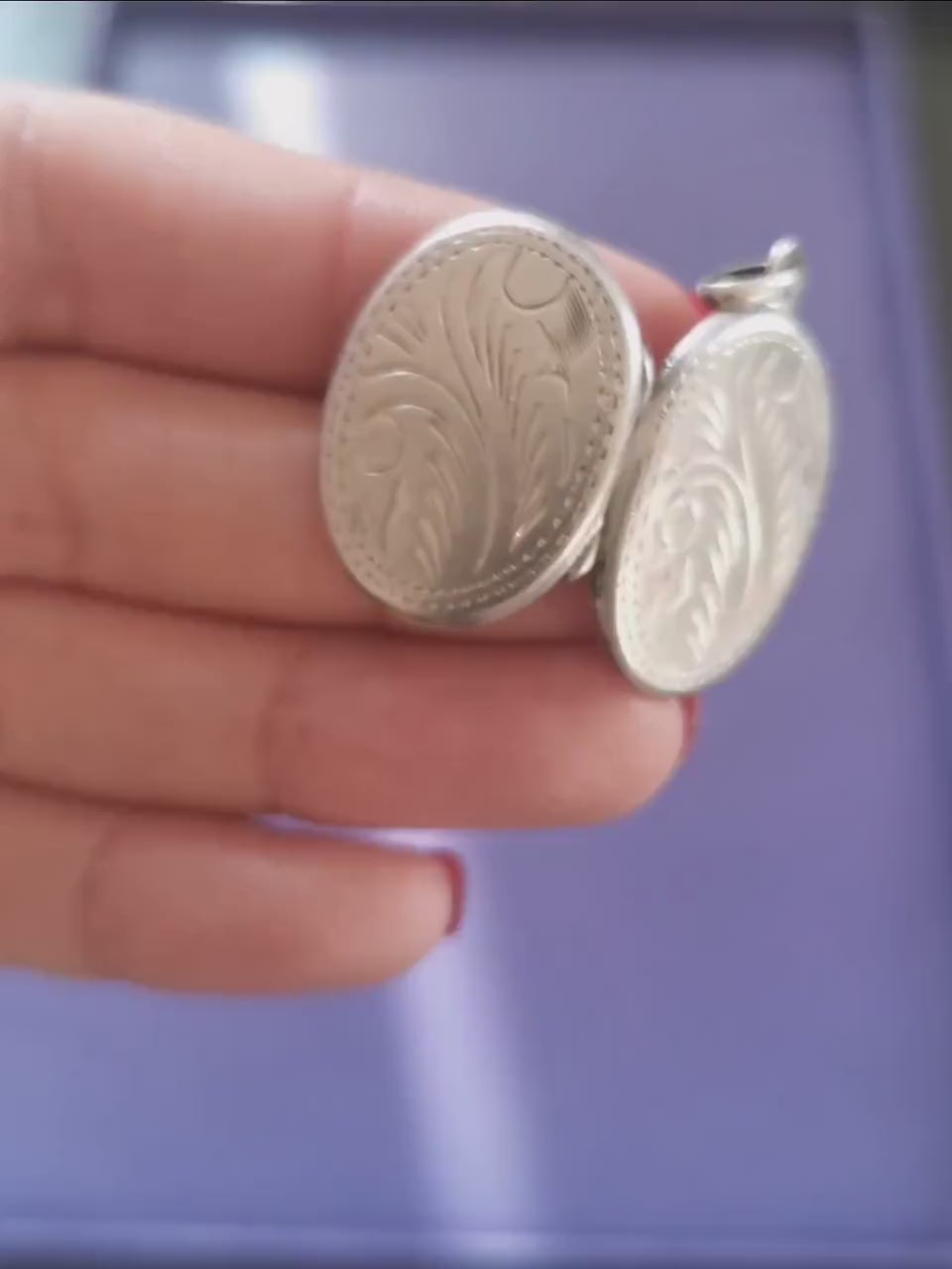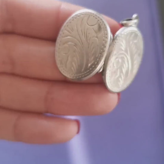 Perfect oval silver locket, British in origin. It bears the hallmarks 925 for silver purity. The front is engraved in a classic, asymmetrical early 1900s style, same for the back. The locket closes securely and though no glass remains it could easily be used to store photos or a special memory. The locket has no visible signs of age, and would make a perfect gift.