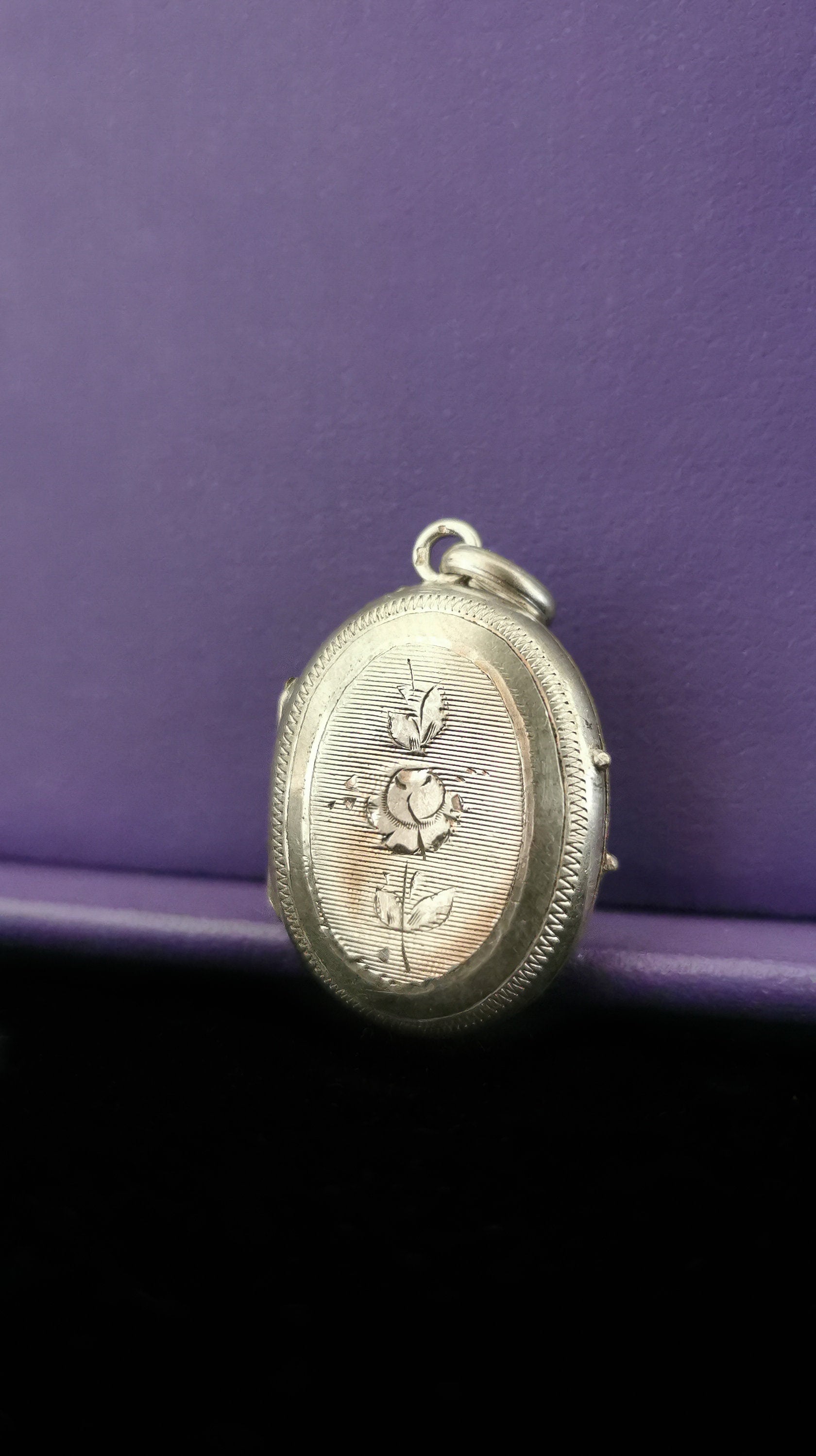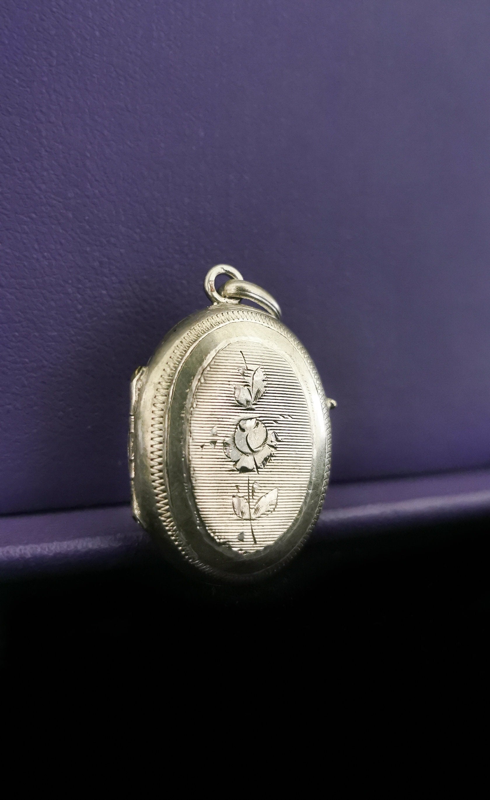An exceptional XIX century silver pendant locket circa 1890 holding a glass partition inside. The Front and back are decorated with guilloche rose flowers and classic flowing art nouveau embellishments. A Cleverly thick cut swing glass interior magnifies picture, flowers, or any trinkets stored inside. This stunning locket is in excellent antique condition with light tarnish, enhancing the engraved details. Silversmith mark and silver crab hallmark on bail. A poetic and sentimental locket you or your loved one will cherish.