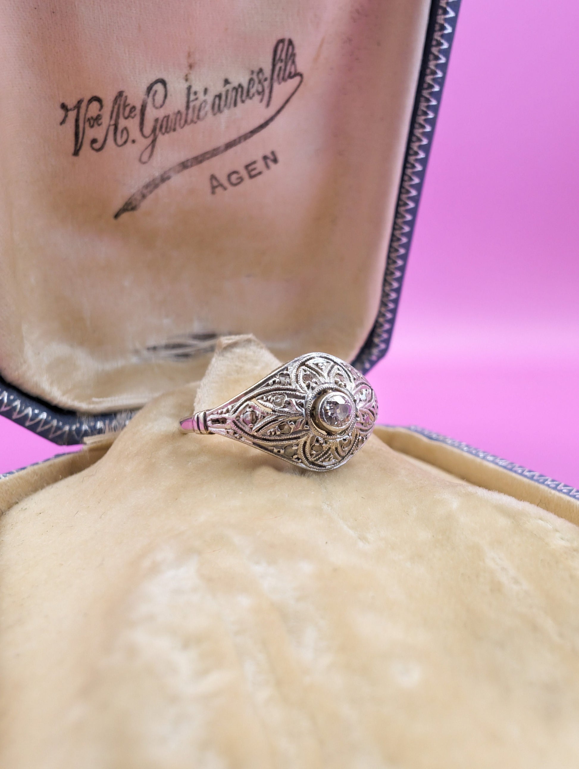 Crafted from 18 carat White Gold & Platinum, this exquisite piece is set with a total of 14 rose-cut diamonds and a larger center diamond of approximately 0.15 carats. Each diamond sparkles with brilliance, captivating the beholder's gaze. Despite its age, this ring is in excellent condition, with some minor scratches to the band consistent with its vintage nature, and light tarnish that can be easily removed.