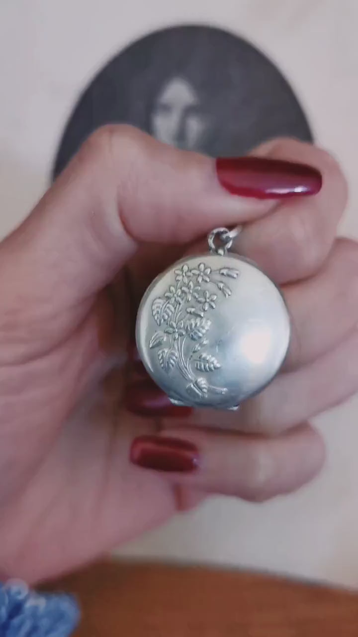 Stunning round silver locket adorned with an exquisite Floral branch engraving design on both the front and back. This French locket, dating back to the early 1900s Art Nouveau period, opens from the top, allowing you to store a cherished memory inside. Despite its age, it remains in excellent antique condition, with only minor, age-appropriate micro-scratches and very light tarnish might persist, that can be easily removed with gentle polish. It securely closes, and its versatile design allows you to wear it on both sides.